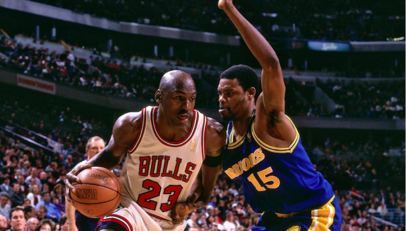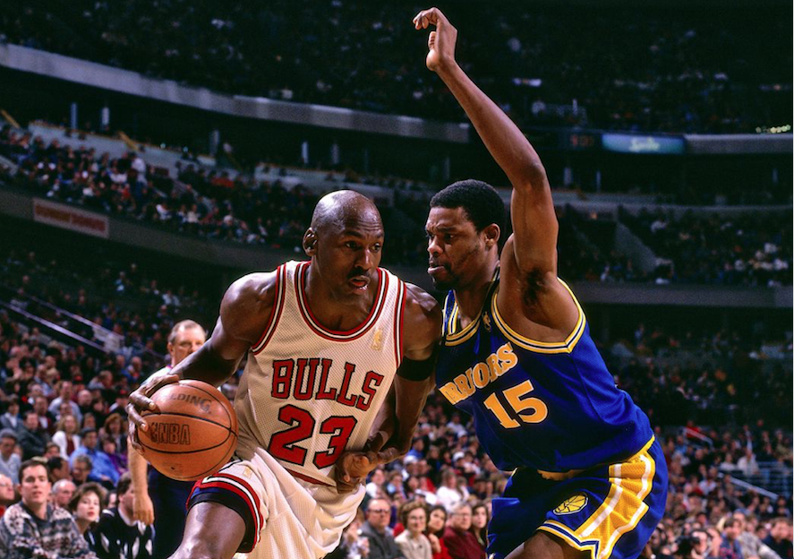 Ainsi habillé en Warriors de la tête aux pieds, avec le n°23 et le wristband au coude, Michael Jordan s’est mesuré à la troupe californienne alors composée de Tim Hardaway, Chris Mullin ou Latrell Sprewell. À vrai dire, alors que Chris Mullin était encore blessé, Michael Jordan voulait s’étalonner face à Tim Hardaway et Latrell Sprewell.