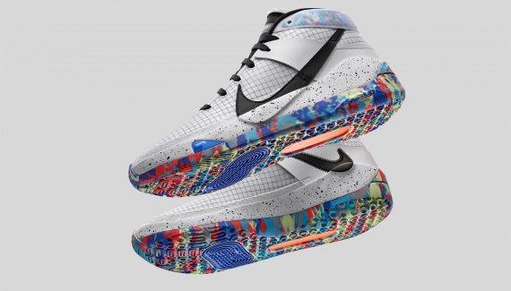 Même chose pour les détails de cette paire : le coloris de base, noir et blanc, avec un touche de bleu, ne fait pas sauter au plafond. Sauf que ce sont les couleurs des Nets, le bleu étant le même que celui du Barclays Center, leur salle. Son nouveau numéro, le 7, est omniprésent – on pourrait croire que la chaussure se nomme « KD 7 » – et c’est une affirmation de sa nouvelle identité new-yorkaise, avant qu’il puisse fouler les parquets NBA la saison prochaine.