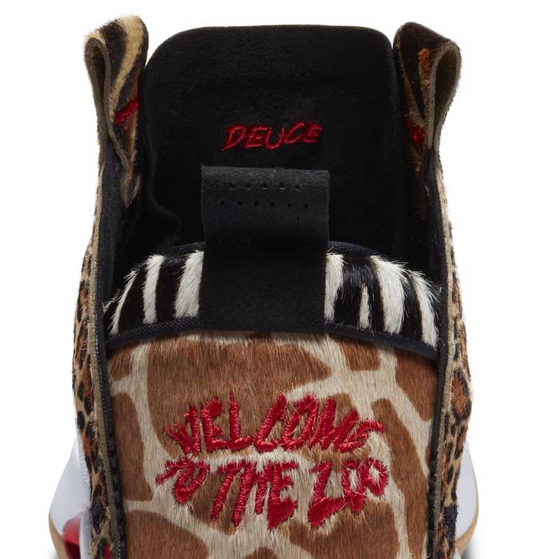 La nouvelle version de la Air Jordan 34 destinée au joueur de Boston présente une base blanche sobre à première vue, mais qui est accompagnée par des empiècements léopard. Le thème animalier est décliné avec des motifs rappelant la girafe, le guépard, et même le zèbre. Car si on observe la partie blanche du plus près, on réalise finalement que des rayures noires se trouvent en-dessous.