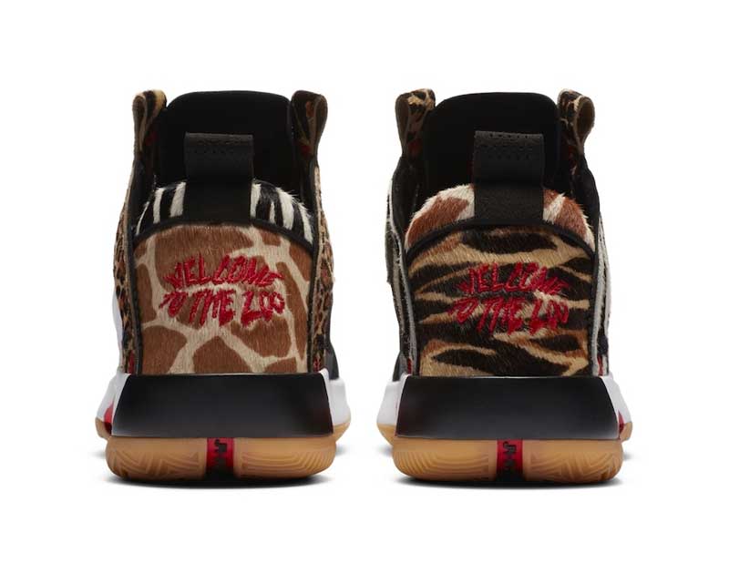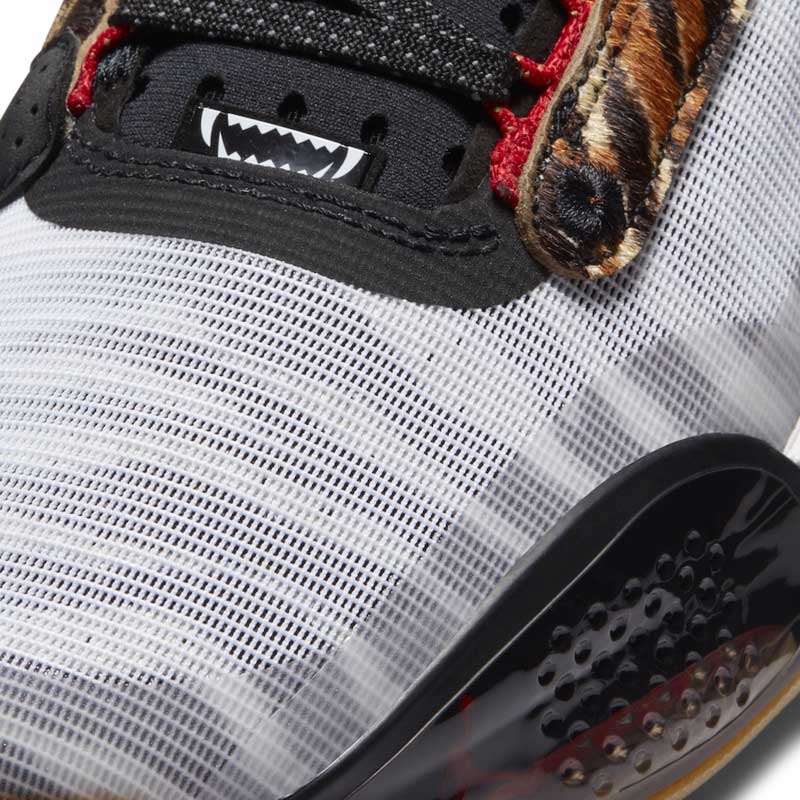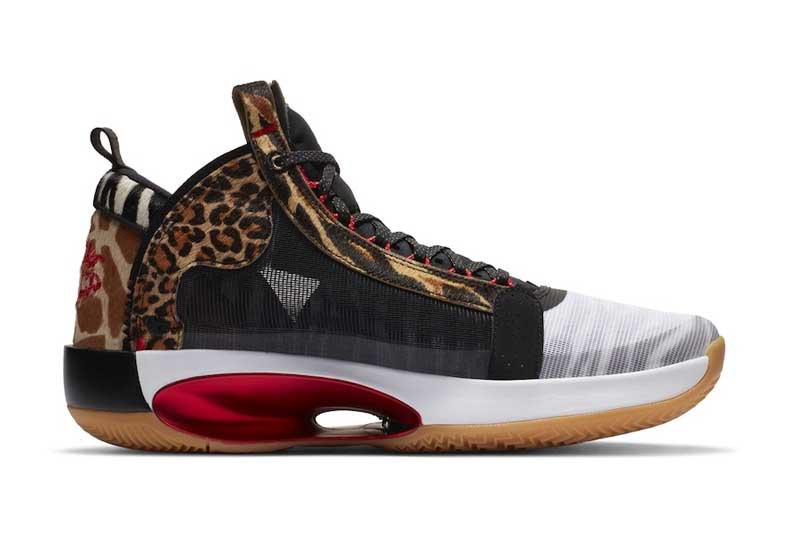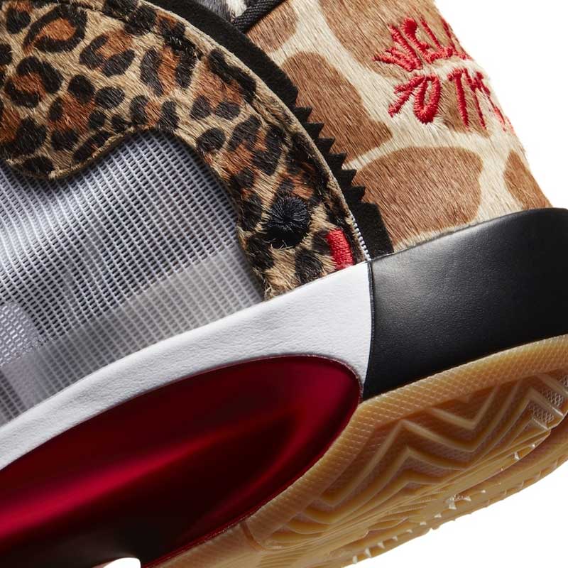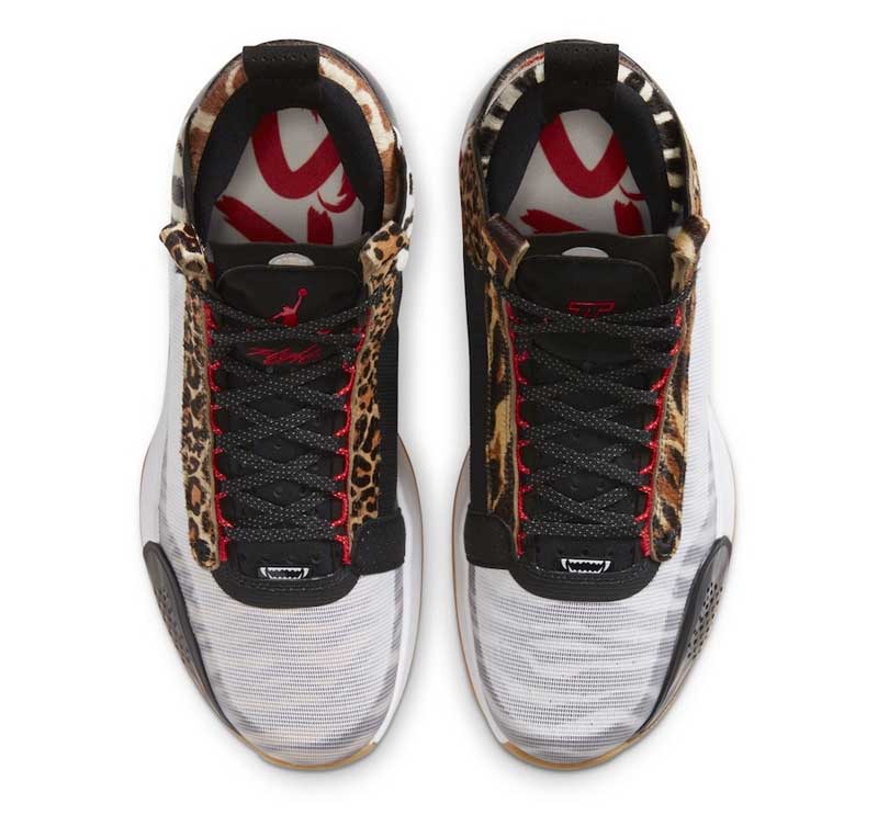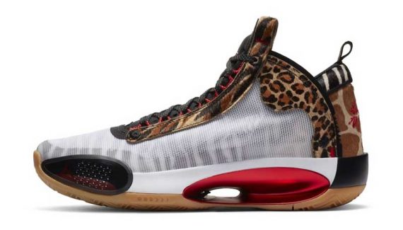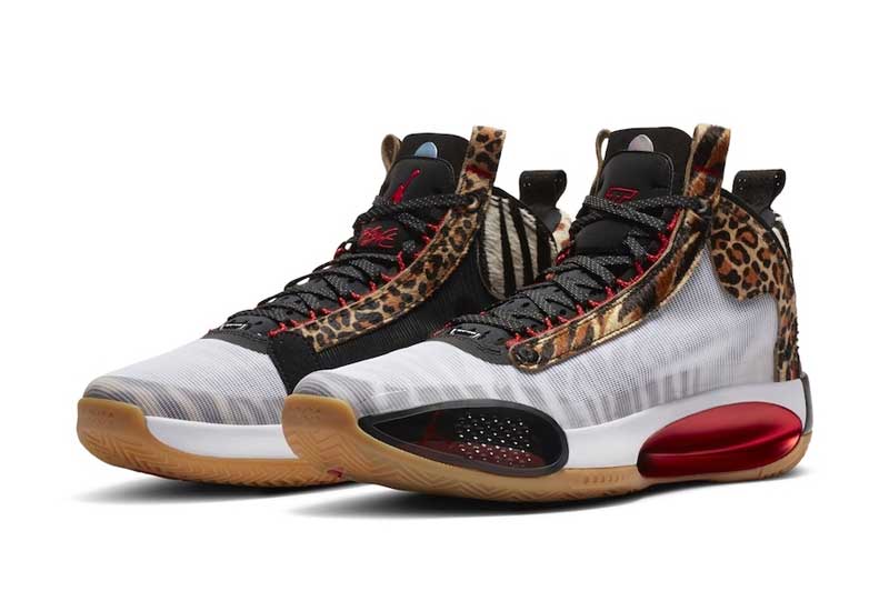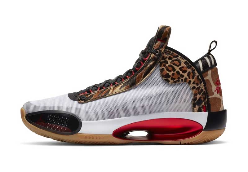 La nouvelle version de la Air Jordan 34 destinée au joueur de Boston présente une base blanche sobre à première vue, mais qui est accompagnée par des empiècements léopard. Le thème animalier est décliné avec des motifs rappelant la girafe, le guépard, et même le zèbre. Car si on observe la partie blanche du plus près, on réalise finalement que des rayures noires se trouvent en-dessous.