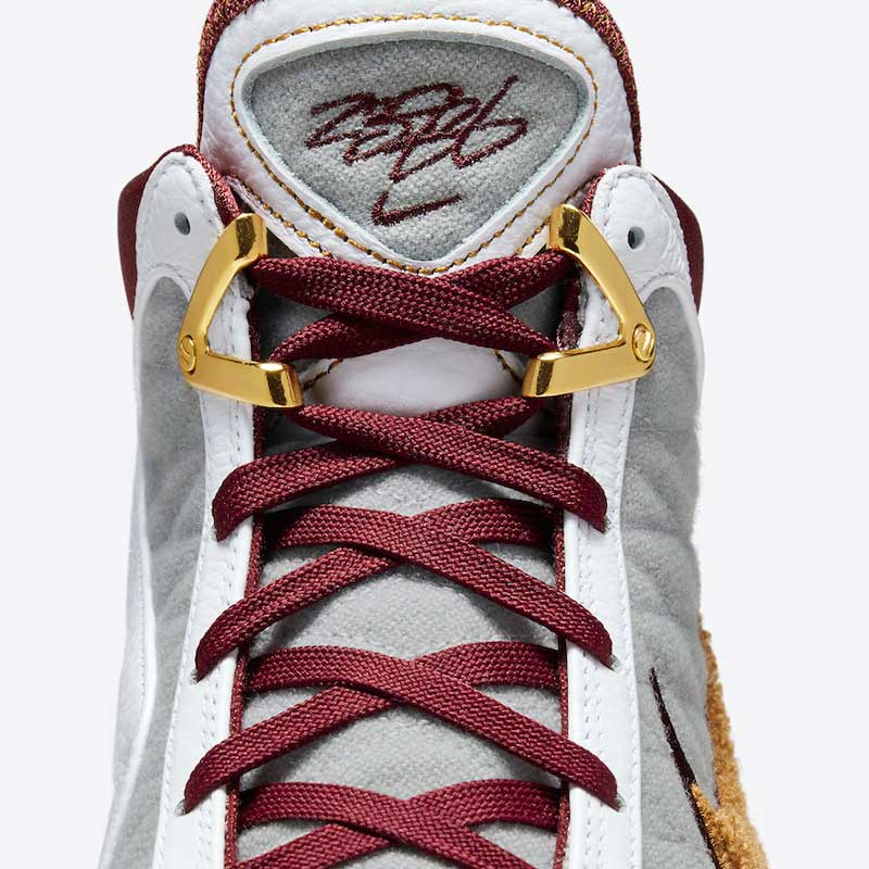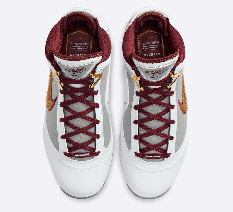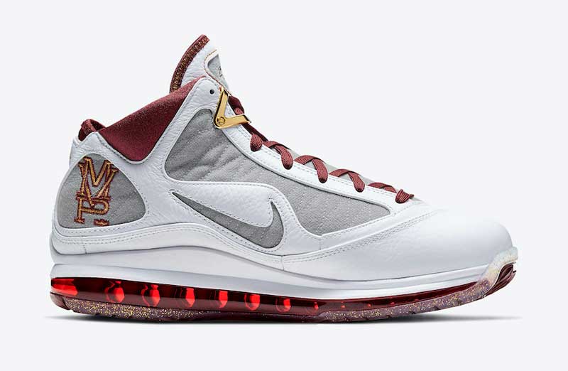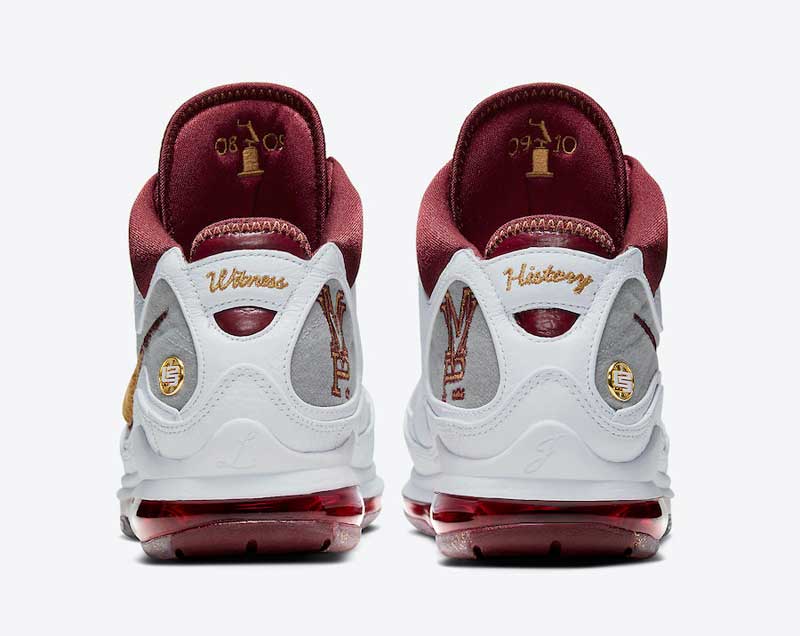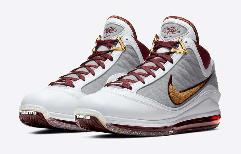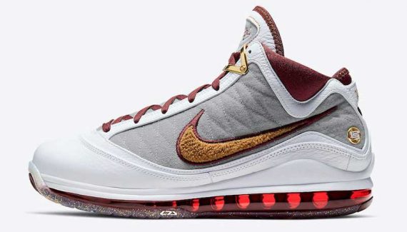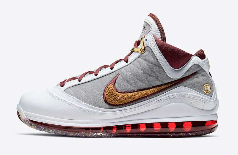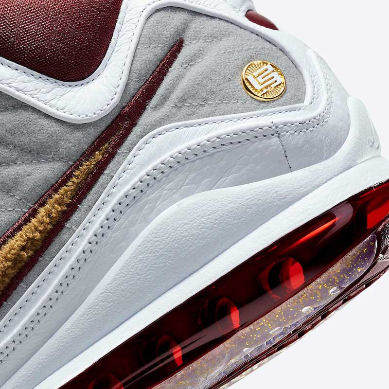 Sur une base de LeBron 7 blanche et grise, Nike a donc ajouté des touches de bordeaux, de jaune et d’or, avec du tissu chenille sur le swoosh. La semelle est remplie de paillettes dorées.
