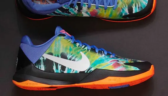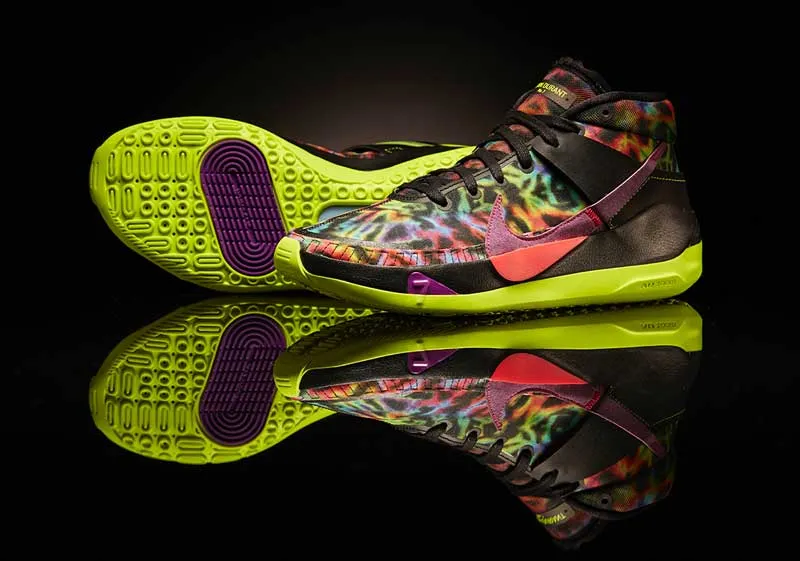 L'ancienne chaussure du “Black Mamba” se retrouve couverte d'un motif “tie-dye” très coloré, sur une semelle orange. Encore moins de discrétion pour la KD13, avec sa semelle quasi-fluorescente et un motif tout aussi coloré.