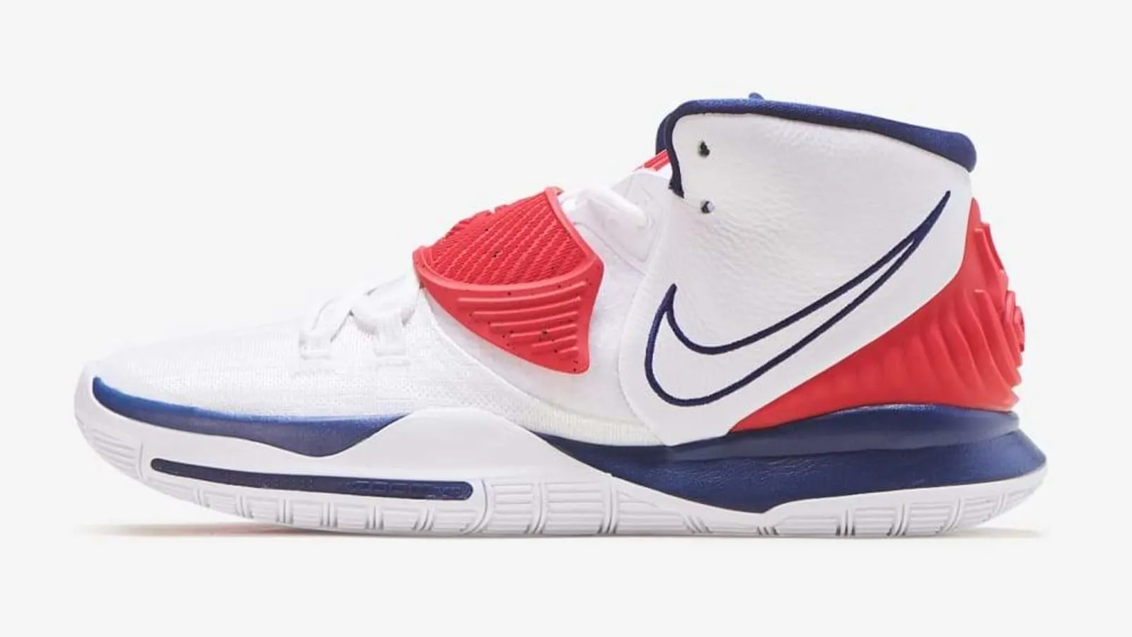 Les KD13, Kyrie 6 et les PG4 n'y échapperont pas, avec une sortie prévue le 3 juillet à leur prix habituel : respectivement 150, 130 et 110 euros. La Kyrie a déjà un coloris « USA », oui, mais cette fois-ci c'est le blanc qui domine, et pas le bleu.