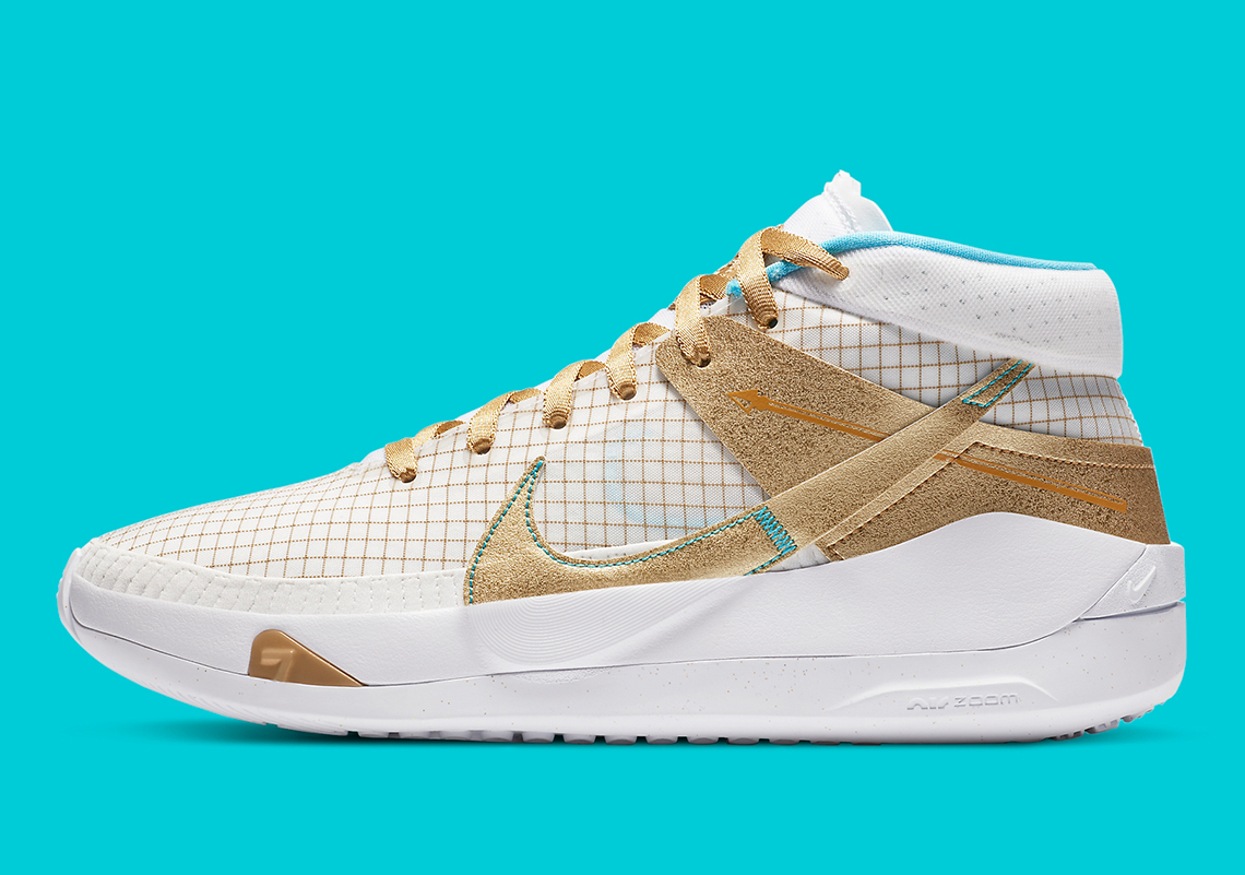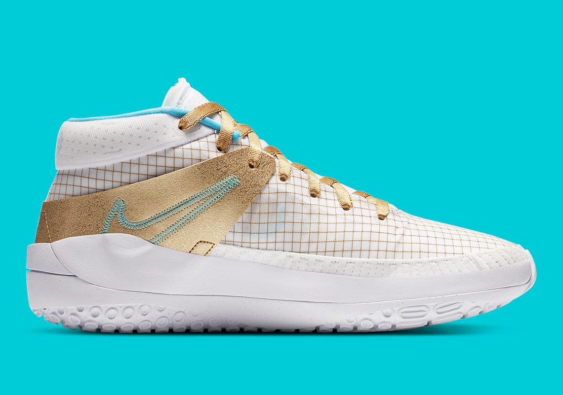 La première porte le nom « EYBL » pour Elite Youth Basketball League, son tournoi de jeunes auquel la marque au Swoosh fait référence tous les ans par l’intermédiaire de la KD, y compris cette année malgré son annulation. Au programme, du doré et une pointe de bleu ciel pour le faire ressortir. Elles seront disponibles le 28 juillet.
