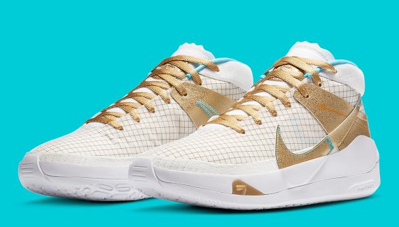 La première porte le nom « EYBL » pour Elite Youth Basketball League, son tournoi de jeunes auquel la marque au Swoosh fait référence tous les ans par l’intermédiaire de la KD, y compris cette année malgré son annulation. Au programme, du doré et une pointe de bleu ciel pour le faire ressortir. Elles seront disponibles le 28 juillet.
