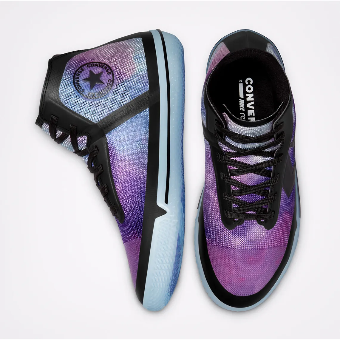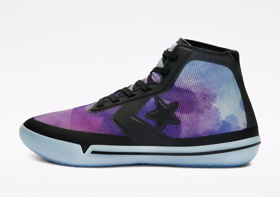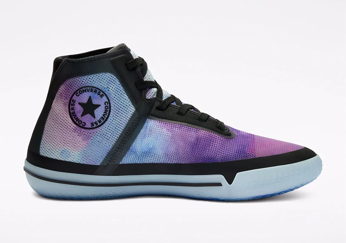 Une gamme qui comprend les All Star Pro BB en version haute et basse, avec pour la première un coloris représentant bien l'ailier des Suns : un tie and dye violet psychédélique. Pour la deuxième, histoire de contrebalancer avec la paire en feu de l'automne dernier, celle-ci est couverte en partie d'eau.