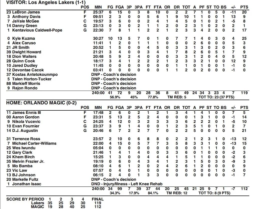 Los Angeles a tenté sur certaines séquences une défense de zone. Elle a bien fonctionné puisque le Magic a mis plusieurs minutes à trouver des ouvertures. En attaque, c'est Kuzma qui a libéré les siens avec ses quatre shoots à 3-pts à 100 % de réussite en premier quart-temps. L'écart est déjà fait (35-19).