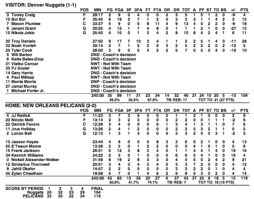 « J'ai été très fier de nos jeunes. Les titulaires ont seulement joué 14 minutes environ. Nos jeunes ont été très bons ». S'il fallait encore une preuve de la qualité des jeunes de l'effectif des Pelicans, on retiendra que c'est Nickeil Alexander-Walker qui a fait le travail cette nuit, rendant 21 points, 5 passes décisives, 2 interceptions et 2 contres dans le succès 119-104 des siens face à Denver, toujours en mode « tall ball ».