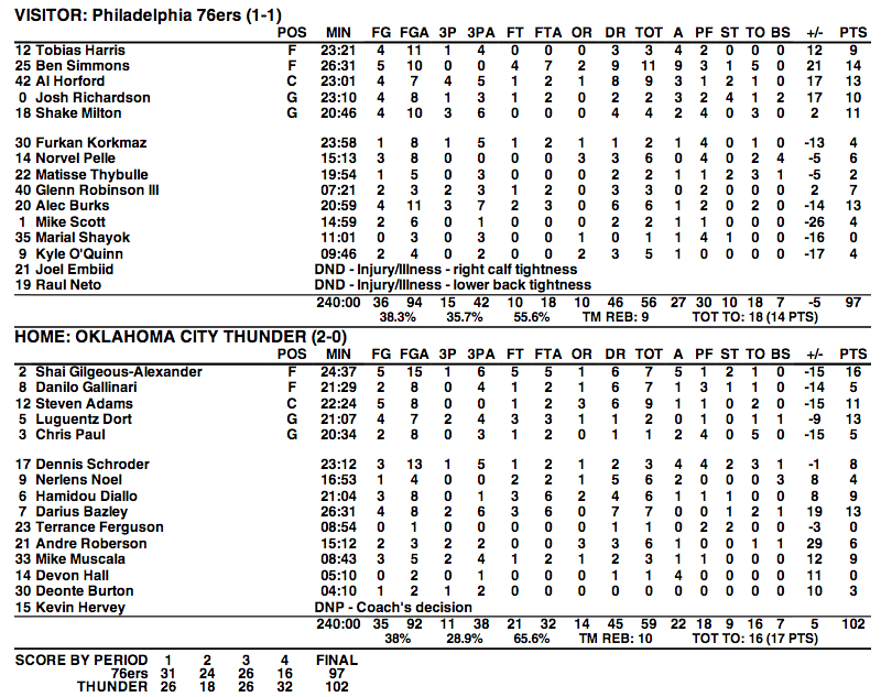 Même sans Joel Embiid, les Sixers ont globalement dominé la rencontre face au Thunder, avec un Ben Simmons très actif (14 points, 11 rebonds, 9 passes mais 5 pertes de balle en 26 minutes) et une bonne circulation globale du ballon, avec pas mal de coupes dans le dos de la défense, qui ont mis à mal Oklahoma City.