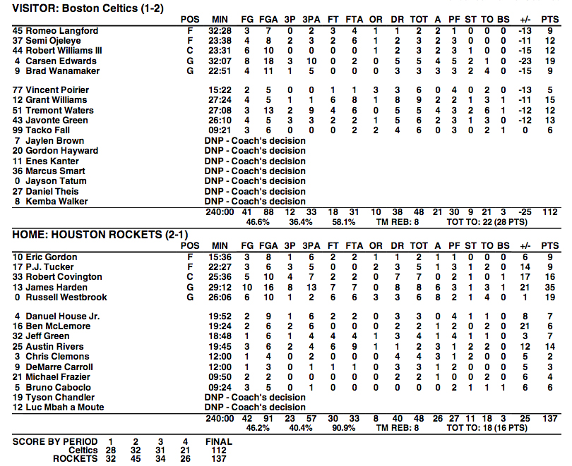 Ce dernier “scrimmage” a encore illustré la force de frappe des Rockets, James Harden dynamitant la défense des Celtics à grands coups de 3-points (35 points à 8/13 de loin, 8 rebonds et 6 passes).