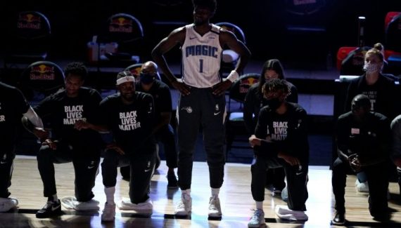 C’est l’image de cette deuxième soirée de la reprise de la NBA : Jonathan Isaac, debout, avec son maillot du Magic sur le dos, alors que les joueurs et les coaches des Nets et du Magic sont à genoux avec leur T-Shirt “Black Lives Matter”. Le jeune intérieur d’Orlando est le premier joueur à ne pas mettre un genou à terre depuis la reprise, et il avait prévenu ses coéquipiers et ses entraîneurs de sa décision.