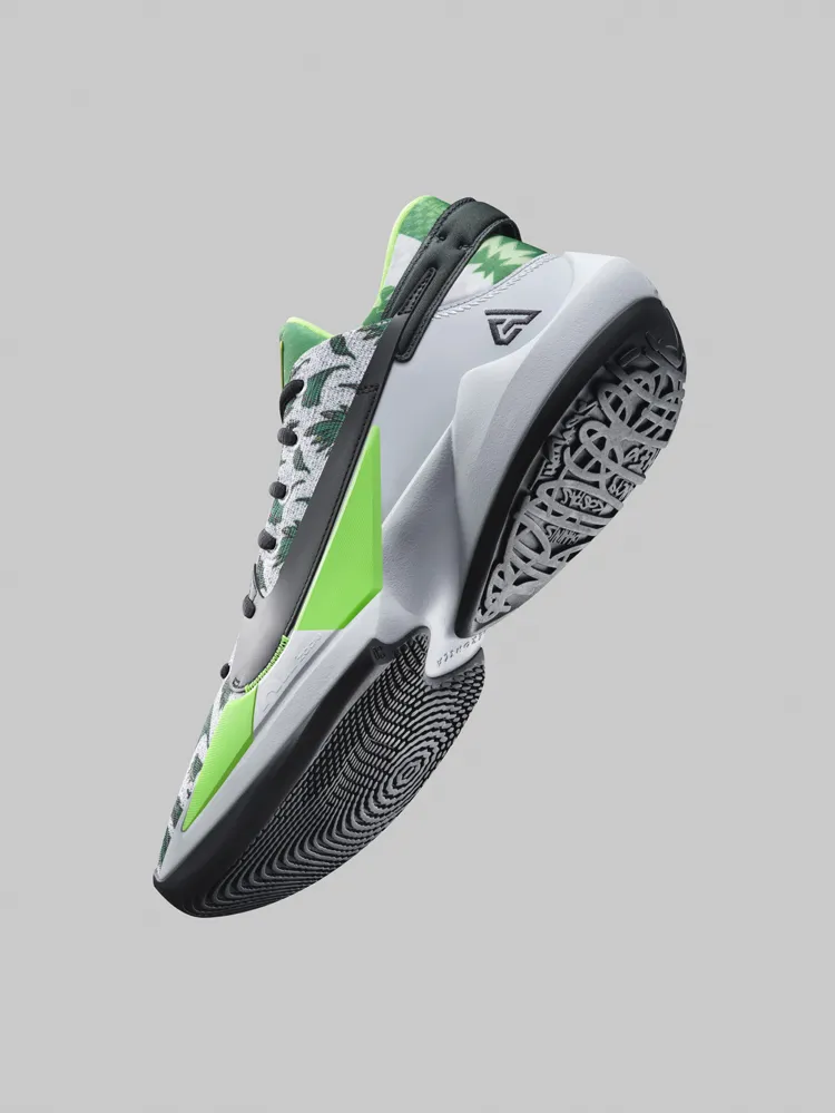 « Pour la Freak 2, on a déplacé notre attention sur ses mouvements, car Giannis peut maitriser chaque endroit du terrain » explique Ross Klein de chez Nike, qui a remplacé le double Zoom à l’arrière par à une unité simple à l’avant, avec un trou dans la semelle intérieure pour plus de court feel : « tu touches le Zoom, qui touche le sol » résume le “Greek Freak”.