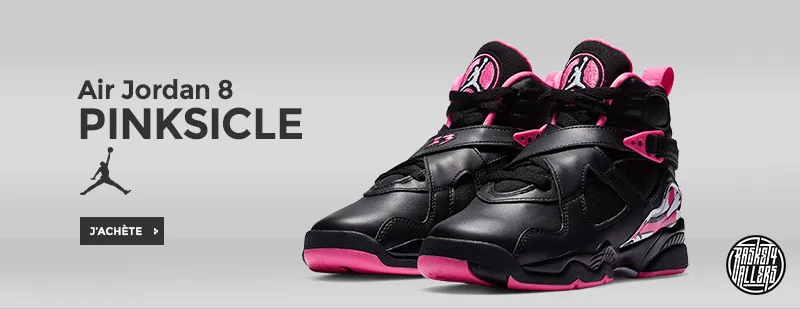 Shoppez maintenant sur Basket4Ballers.com les Girls Air Jordan 8 “Pinksicle” dans une nouvelle édition faite de cuir noir, de tissu rose et d'un empiècement à motif sur le talon.