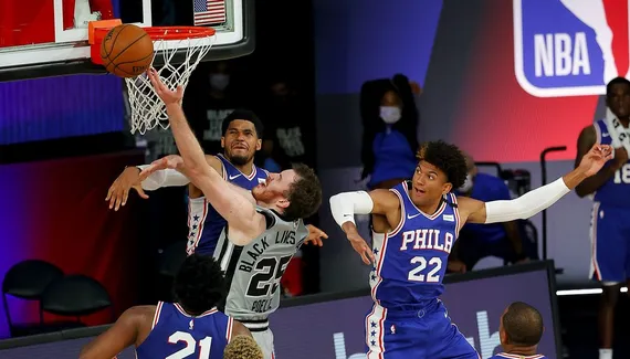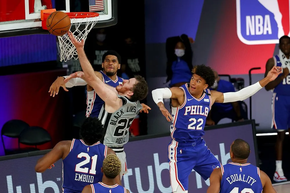 Il reste dix secondes à jouer. Les Spurs mènent 130-128. Sur la remise en jeu des Sixers, Jakob Poeltl se bat pour passer devant Joel Embiid et rendre difficile une éventuelle passe. Comme si cela ne suffisait pas, Dejounte Murray flotte autour du pivot, prêt à intervenir.