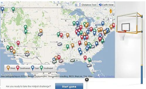 En l'occurrence, il vous propose carrément une visite en 3D des 14 salles dans lesquelles vont se disputer le tournoi NCAA. On peut aussi visiter chaque université qualifiée, et un outil permet, par exemple, de calculer le nombre de kilomètres que va parcourir une équipe pendant le tournoi.