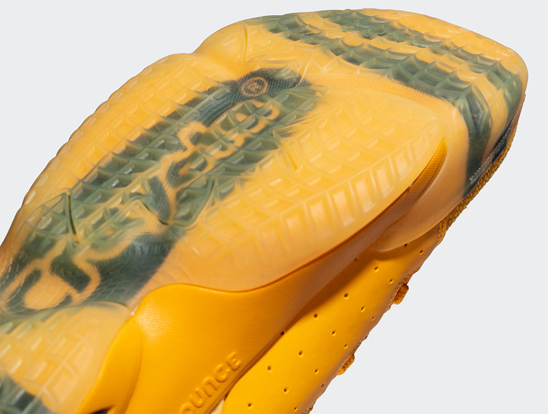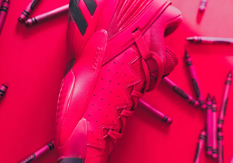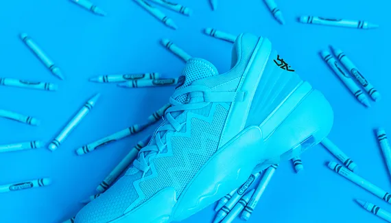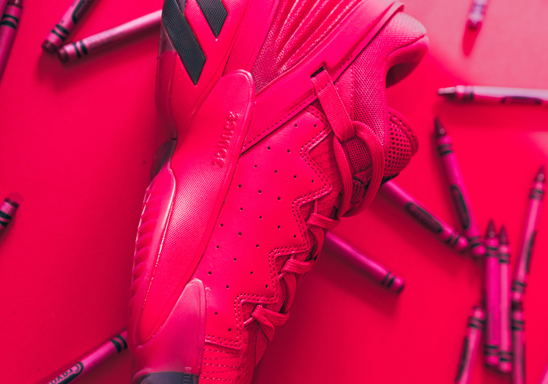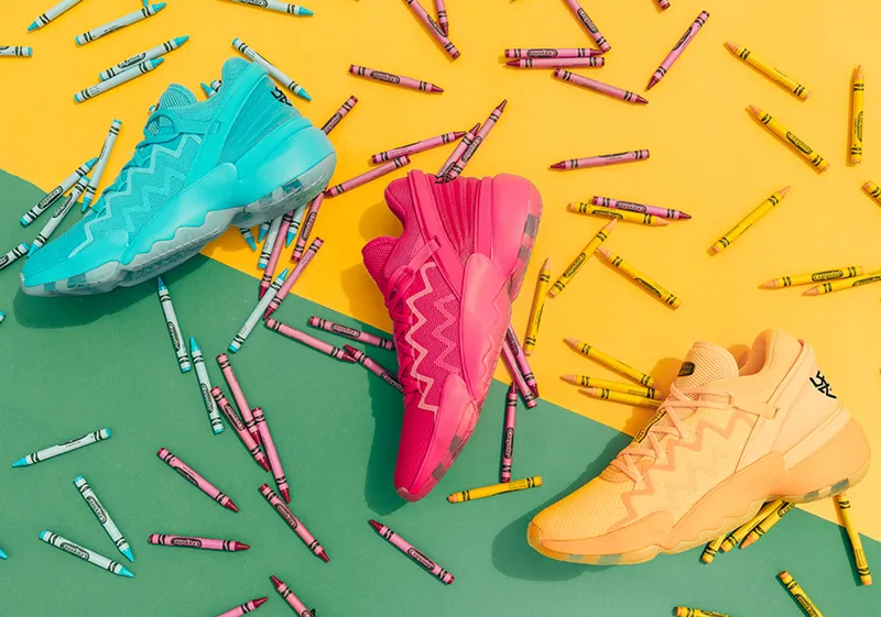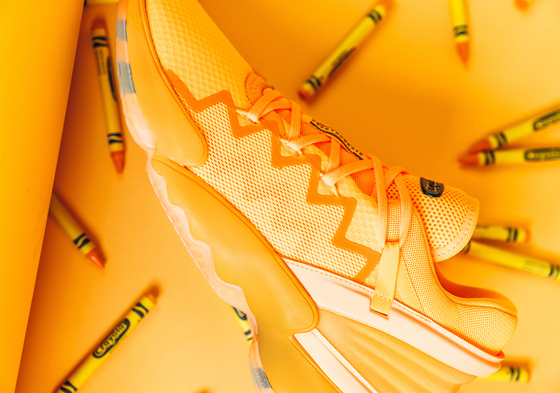 Le logo Crayola apparaît sur la languette, mais aussi sous le pied de la nouvelle signature de Donovan Mitchell, à travers une semelle translucide.