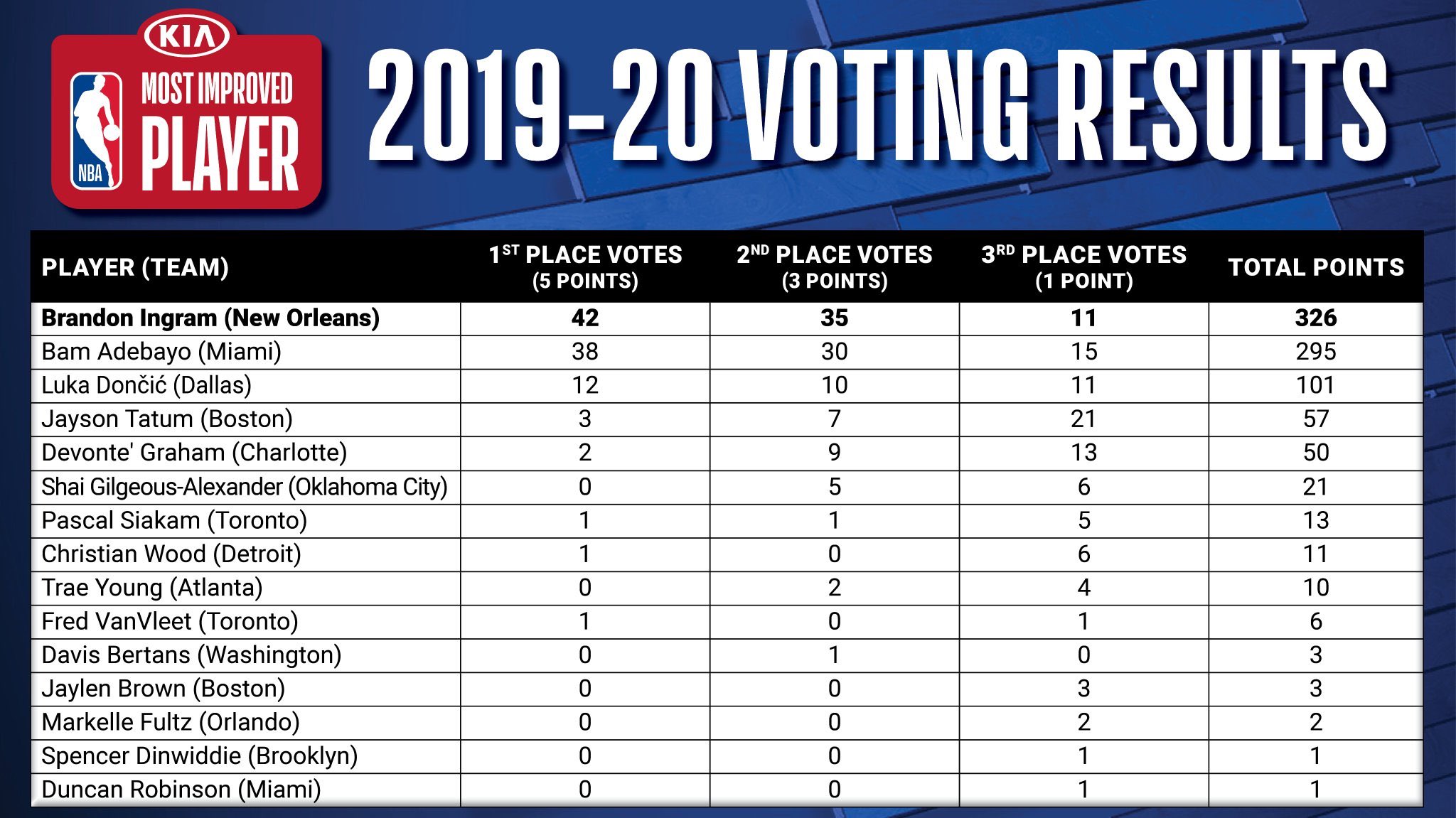 Avec 326 points et 42 1ère place, Brandon Ingram devance Bam Adebayo, également devanu All-Star, second avec 295 points et 38 1ère place. L’ailier des Pelicans et l’intérieur du Heat laissent des miettes à Luka Doncic (3e), Jayson Tatum (4e), et Devonte’ Graham (5e).
