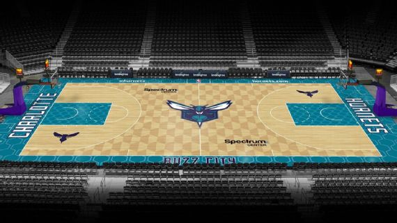 Dans le même temps, les Hornets ont également apporté plusieurs modifications à leur parquet, avec le retour notamment de l’effet ruche, cette fois, au-delà de la ligne à 3-points. La raquette a elle aussi son petit dessin, avec des alvéoles que l’on retrouve également à l’extérieur du terrain.