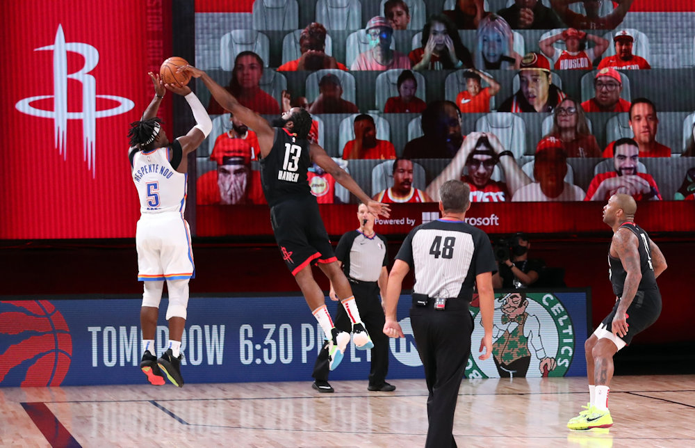 Eric Gordon et Robert Covington réussissent chacun leurs deux premiers tirs à 3-points et ça fait déjà 12 points. À l’inverse, James Harden rate lui ses trois premières tentatives derrière l’arc. Luguentz Dort est bien présent défensivement face au barbu, mais aussi un peu trop offensivement avec déjà six tentatives sur les cinq premières minutes du match. Les Rockets sont devant avec Russell Westbrook qui vient s’imposer poste bas face à Schröder qui tente le flop.