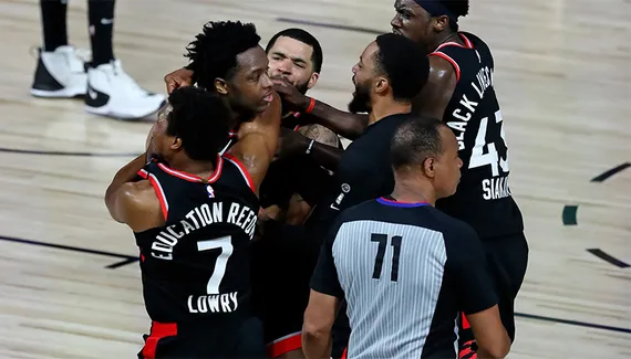 Le problème, c'est que les conditions dans la “bulle” ne sont pas classiques. Il n'y a pas de public, pas de siège au premier rang, et donc beaucoup d'espace. Le meneur des Raptors a ainsi pu reculer pour prendre de l'espace et passer au-dessus du géant sénégalais. Ce qu'il n'aurait peut-être pas réussi dans des conditions classiques.