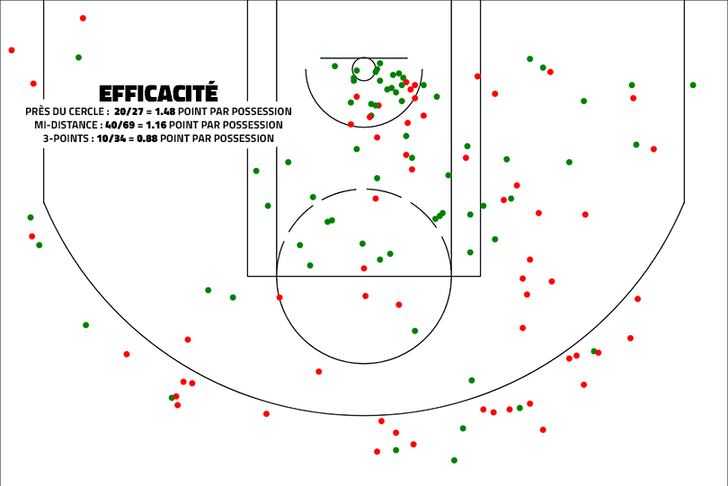 Quand il part sur sa gauche et shoote à mi-distance après un ou plusieurs dribbles, c’est 66 % de réussite. Sur sa droite, c’est 55 % de réussite. Et souvent, son défenseur est bien présent pour contester le tir, mais rien n’y fait.