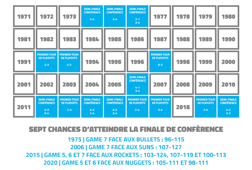 Alors qu’ils menaient 3-1 dans la série, les Clippers ont bien du mal à conclure avec aux Nuggets, et il faut savoir que c’est une habitude chez eux. Surtout au moment d’atteindre cette satanée finale de conférence qui leur échappe depuis toujours. Ainsi, depuis 1975, à sept reprises, les Braves/Clippers ont eu la possibilité de se qualifier pour la finale de conférence, et à chaque fois, ils ont échoué.