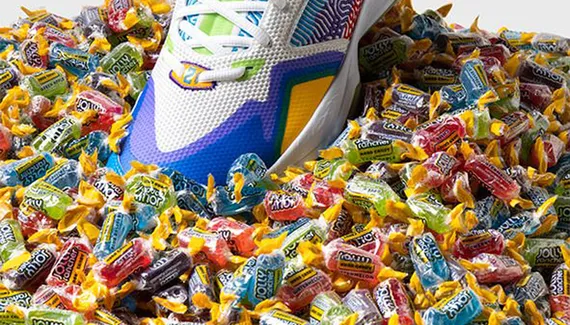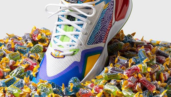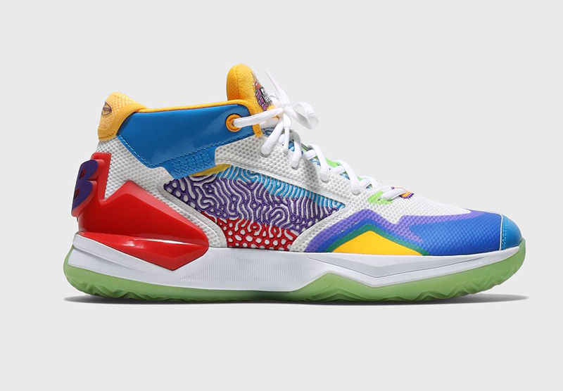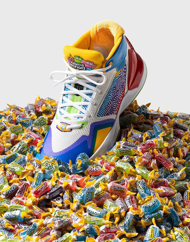 Kawhi Leonard aime bien les Jolly Rancher. En tout cas, New Balance assure qu’il s’agissait de ses bonbons préférés lorsqu’il était jeune. Il affiche donc les couleurs de la marque sur sa KAWHI. Le nom du joueur reste sur la languette, mais accompagné par des fruits colorés… qui restent sérieux, à la Leonard. L’ensemble de la teinte joue la carte des couleurs vives.