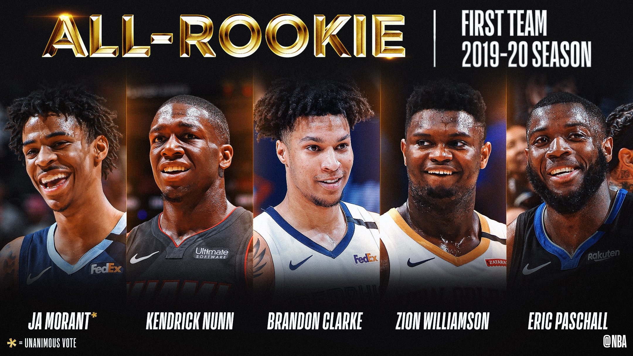 Le premier est composé des trois finalistes du trophée de ROY – Ja Morant (Memphis), Zion Williamson (New Orleans) et Kendrick Nunn (Miami) – rejoints par un second Grizzly, Brandon Clarke, et le Warrior Eric Paschall.