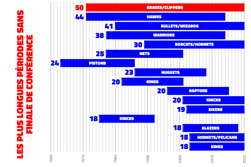 Aucune franchise n’a connu une telle disette puisque la seconde plus longue série est la propriété des Hawks, avec 44 saisons de suite. Mais elle a été brisée en 2015, quand Atlanta a affronté Cleveland pour une place en Finals. Sans cet épisode, la franchise de Géorgie serait sur les mêmes traces que celle de Los Angeles.