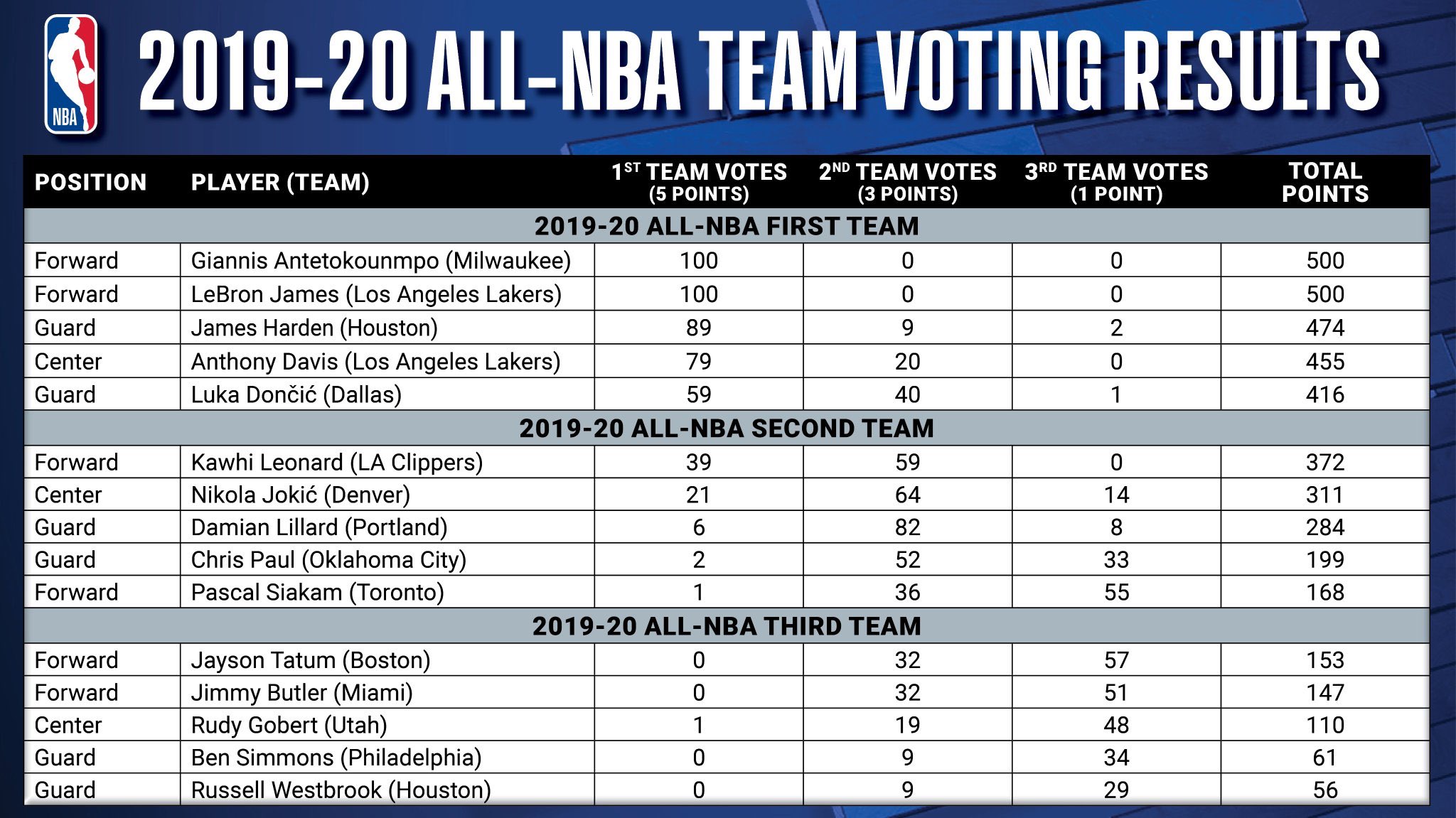 Le “Greek Freak” et le “King” sont élus à l’unanimité (500 points) et c’est d’ailleurs un record pour l’ailier des Lakers, élu pour la 16e fois dans une des meilleures équipes de la saison (13 fois dans la première, deux fois dans la deuxième et une fois dans la troisième). Kareem Abdul-Jabbar, Kobe Bryant et Tim Duncan se sont eux arrêtés à 15.