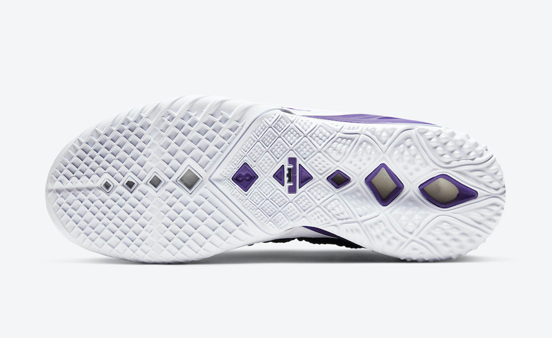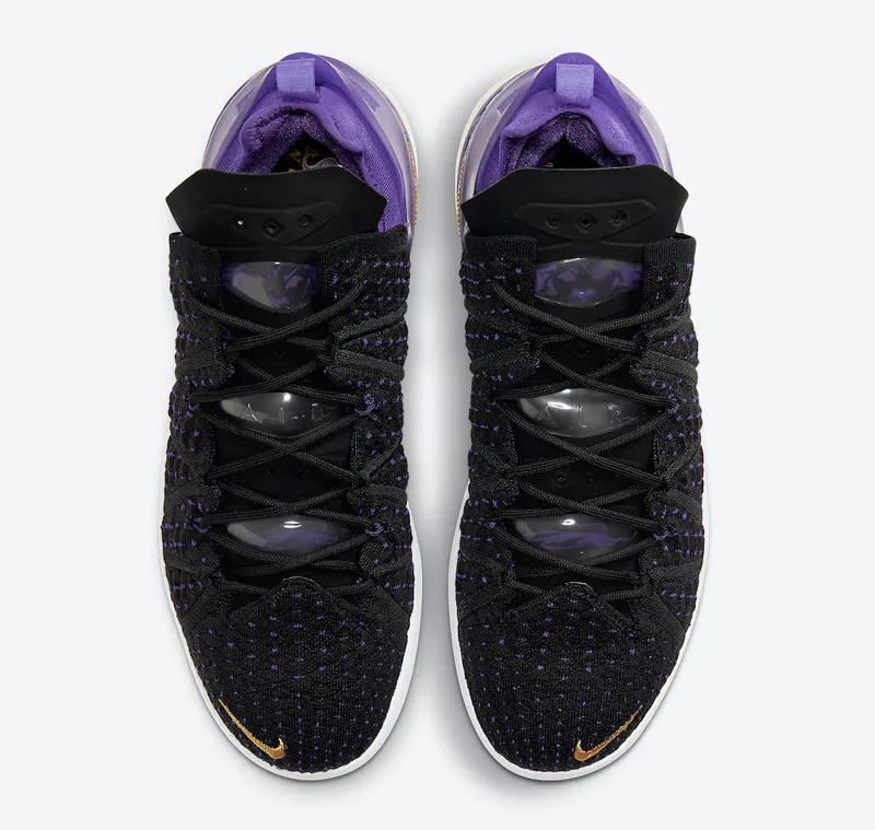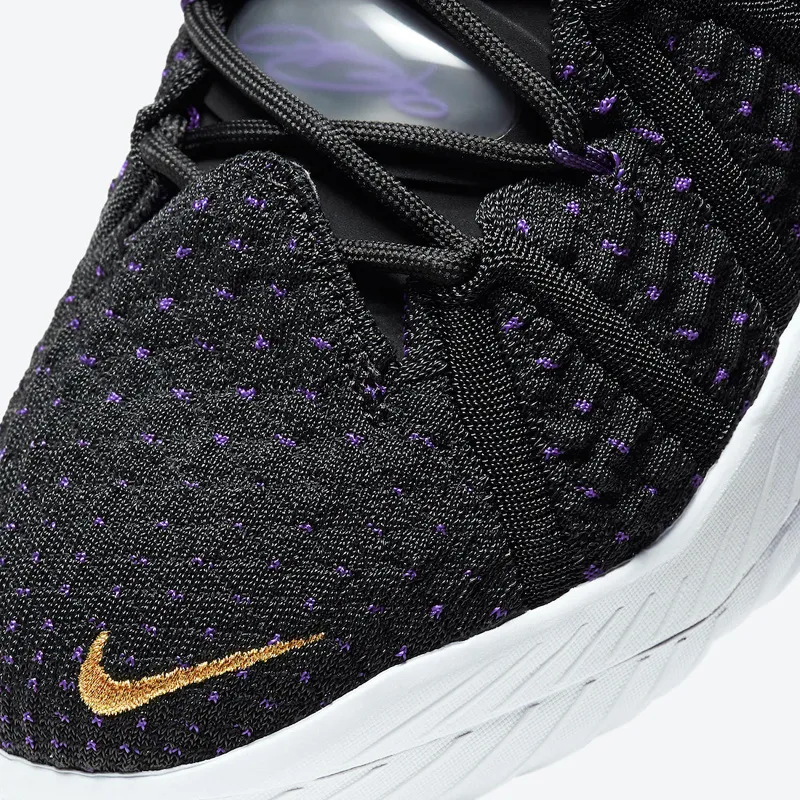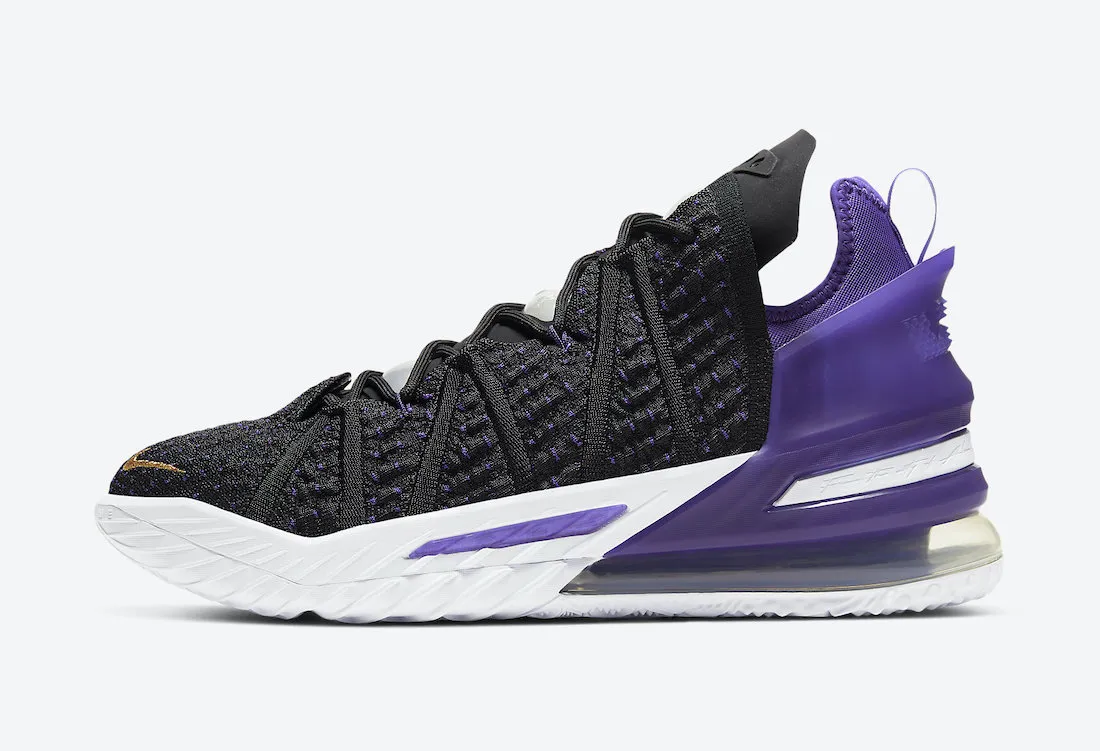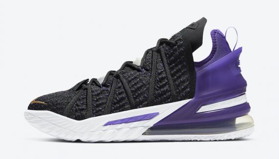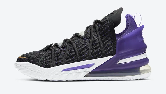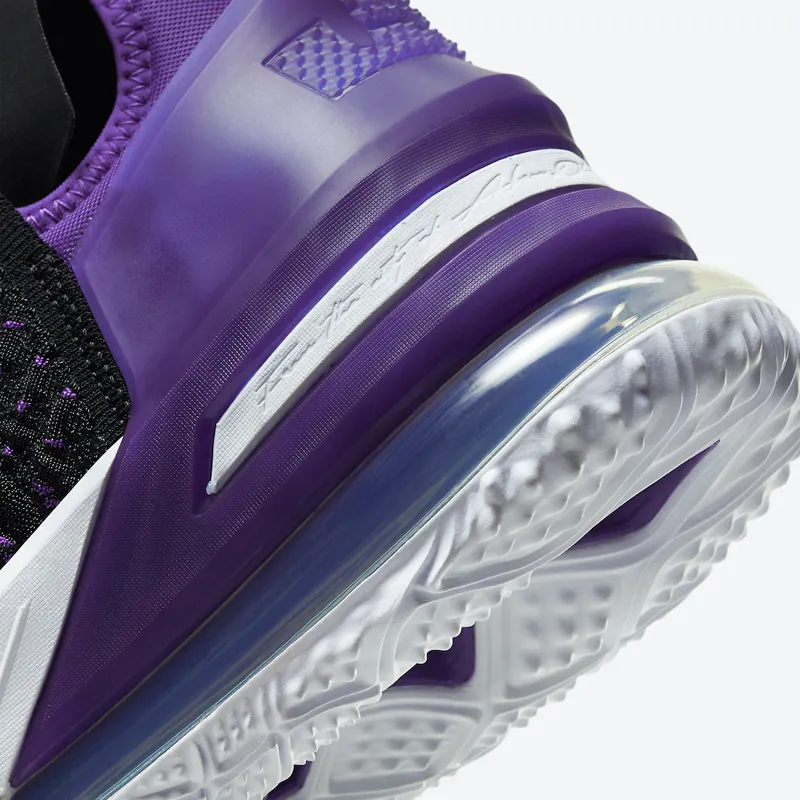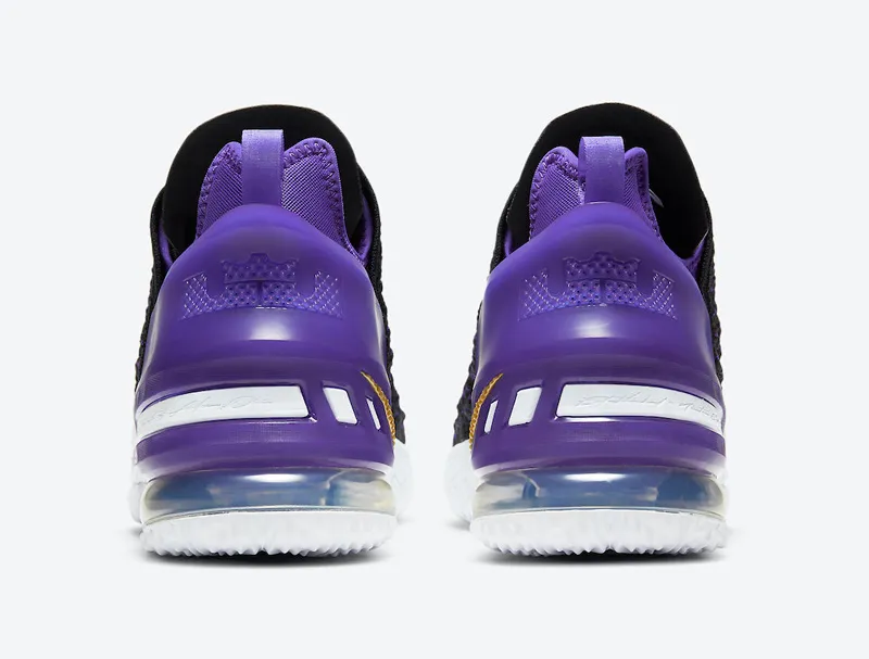 Une base noire, quelques touches de mauve. Pas de doutes, cette LeBron 18 est destinée à la tenue « Statement » des Lakers.