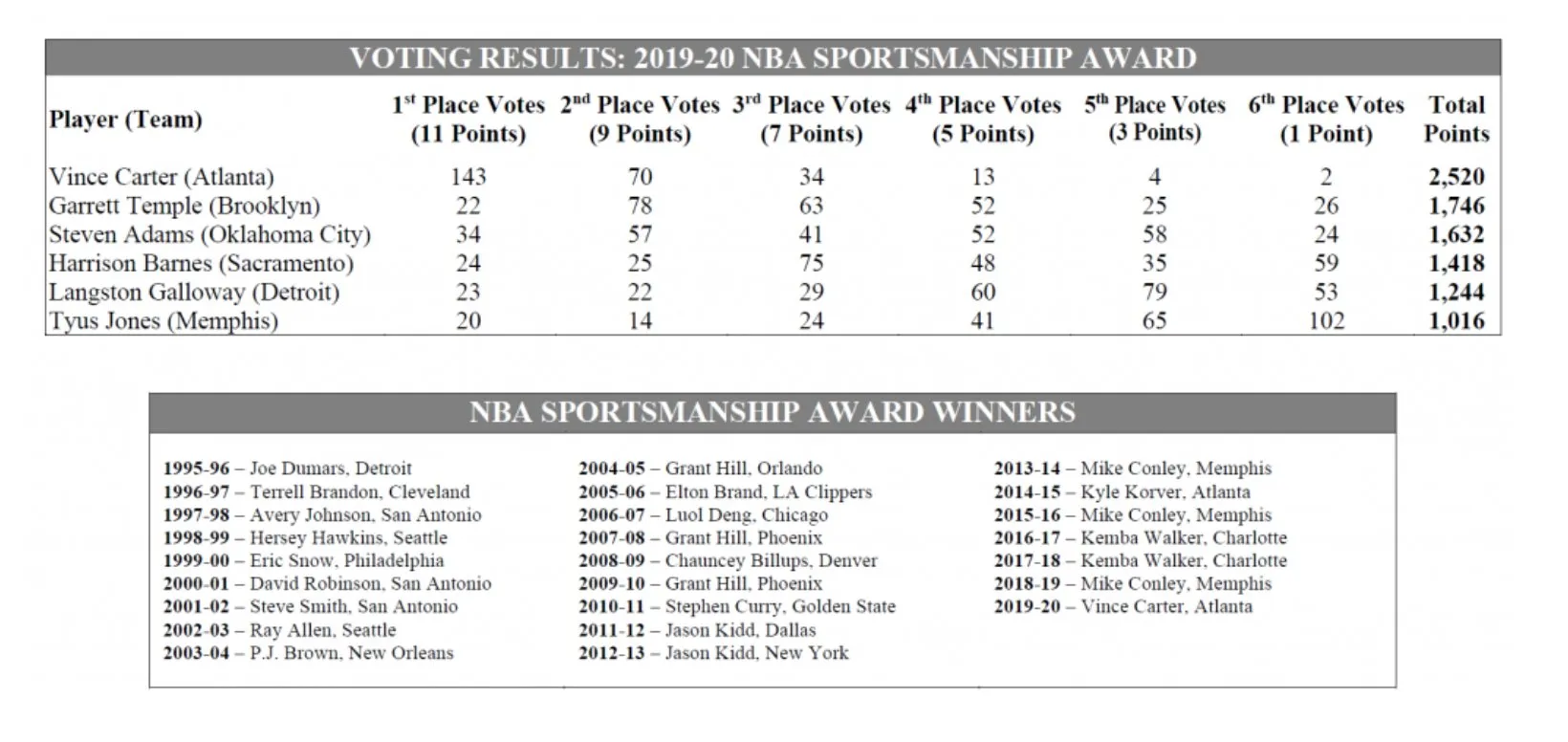 Avec 2 520 points, Vince Carter devance Garrett Temple (1 746 points), Steven Adams (1 632 points), Harrison Barnes (1 418 points), Langston Galloway (1 244 points) et Tyus Jones (1 016 points).