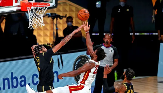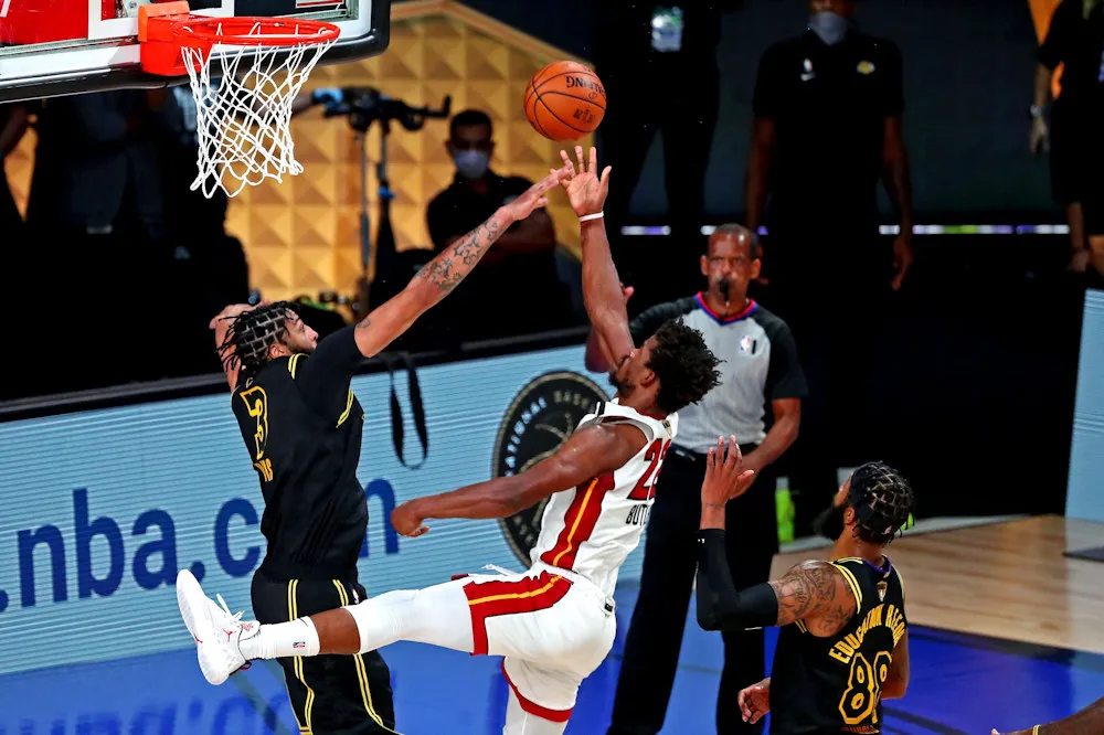 Jimmy Butler répond alors en leader en marquant cinq points de suite pour redonner de l'air au Heat, mais le King ne relâche pas la pression. Il profite de la maladresse du Heat dans la raquette pour pousser la balle en transition et s'offrir des tirs faciles. Après avoir limité les Lakers à 34 points près du cercle lors des deux derniers matchs, Miami en laisse 28 sur cette première mi-temps. Dans le sillage de James, LA efface son retard. Il faut un effort de Butler et un 3-points dans les dernières secondes pour garder Miami devant (60-54).