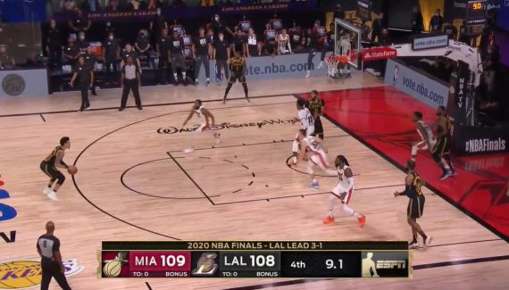 Le sort du Game 5 entre le Heat et les Lakers s’est sans doute joué sur cette dernière possession. LeBron James attire trois défenseurs sur lui, et il ressort pour Danny Green tout seul à 3-points.