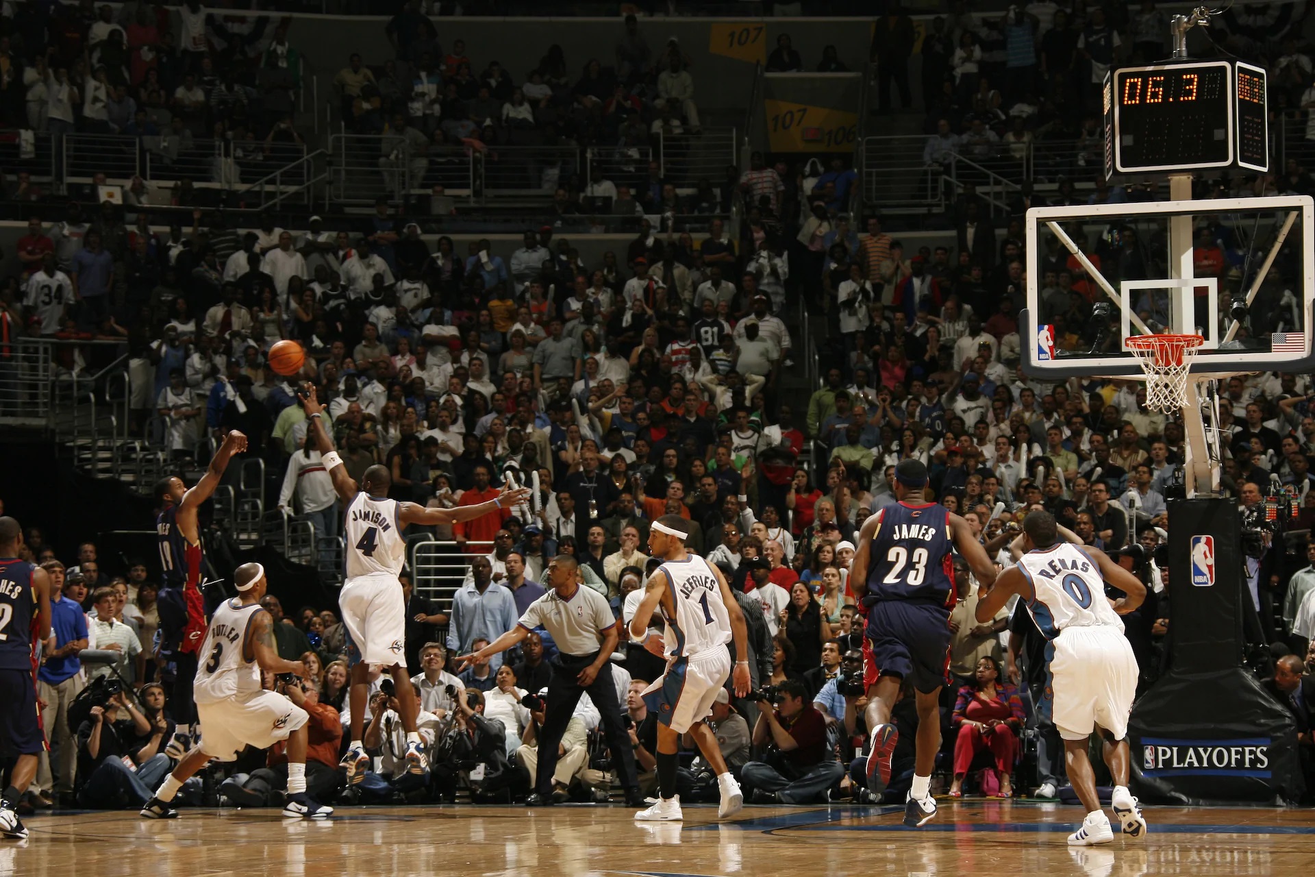 Pris à deux, comme cette nuit lorsque Duncan Robinson est venu aider Jimmy Butler, LeBron James a alors transmis le ballon à Larry Hughes qui a pu trouver Damon Jones ouvert dans le corner pour le shoot de la gagne.