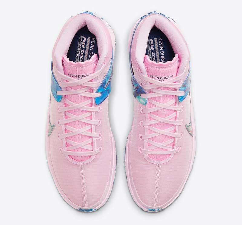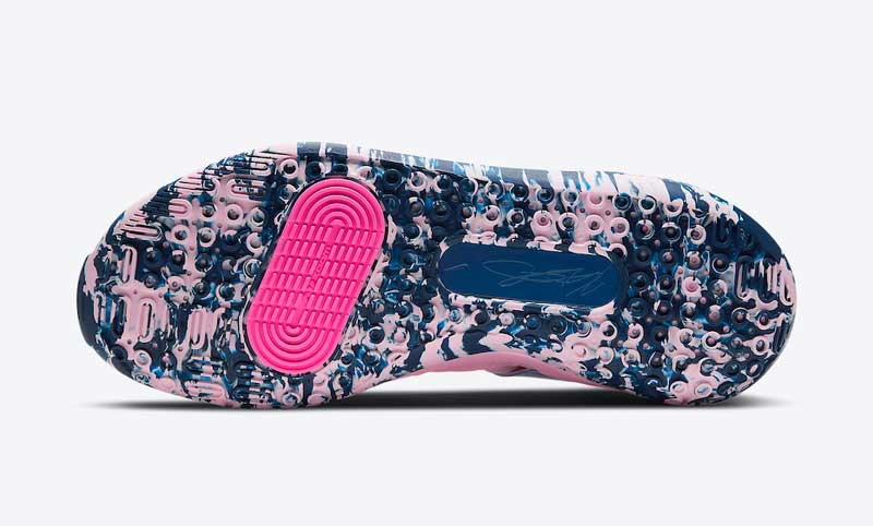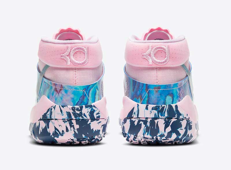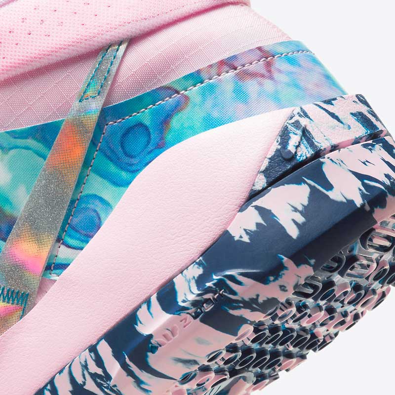 Une teinte très réussie, puisque le rose est accompagné de bleu sur une semelle marbrée et un renfort talon aux allures de pierre précieuse.