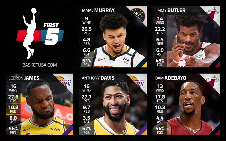 Dans le premier cinq, on retrouve les deux duos forts de ces playoffs : LeBron James et Anthony Davis côté Lakers, Jimmy Butler et Bam Adebayo côté Heat. Ce dernier a fini la campagne diminué par des blessures à l'épaule et au cou, mais on n'oubliera pas ses performances antérieures, et notamment en finale de conférence face aux Celtics.