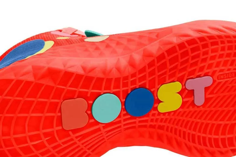 Le plus important, c’est qu’on voit sur ces images que la chaussure semble particulièrement rembourrée autour de la cheville. L’empeigne en mesh est renforcée sur les zones stratégiques. Le motif de la semelle est original. Il faudra voir s’il accroche bien le parquet. Comme l’inscription l’indique, c’est la mousse Boost qui assurera l’amorti.