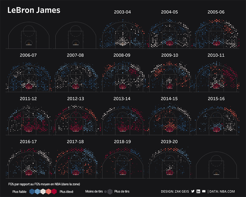 On peut également y voir l’évolution de la NBA, qu’il a donc su accompagner. À son arrivée en 2003, la “révolution du 3-points” n’a pas encore débuté et le jeune “King” est surtout dominant près du cercle. Petit à petit, on le voit améliorer son efficacité sur “l’elbow”, et notamment du côté gauche du panier, sa zone préférée.