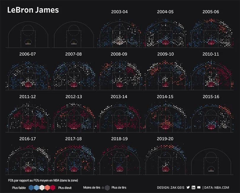 On peut également y voir l'évolution de la NBA, qu'il a donc su accompagner. À son arrivée en 2003, la “révolution du 3-points” n'a pas encore débuté et le jeune “King” est surtout dominant près du cercle. Petit à petit, on le voit améliorer son efficacité sur “l'elbow”, et notamment du côté gauche du panier, sa zone préférée.