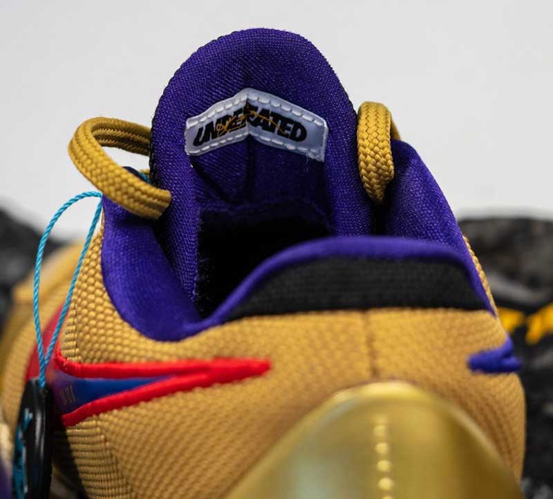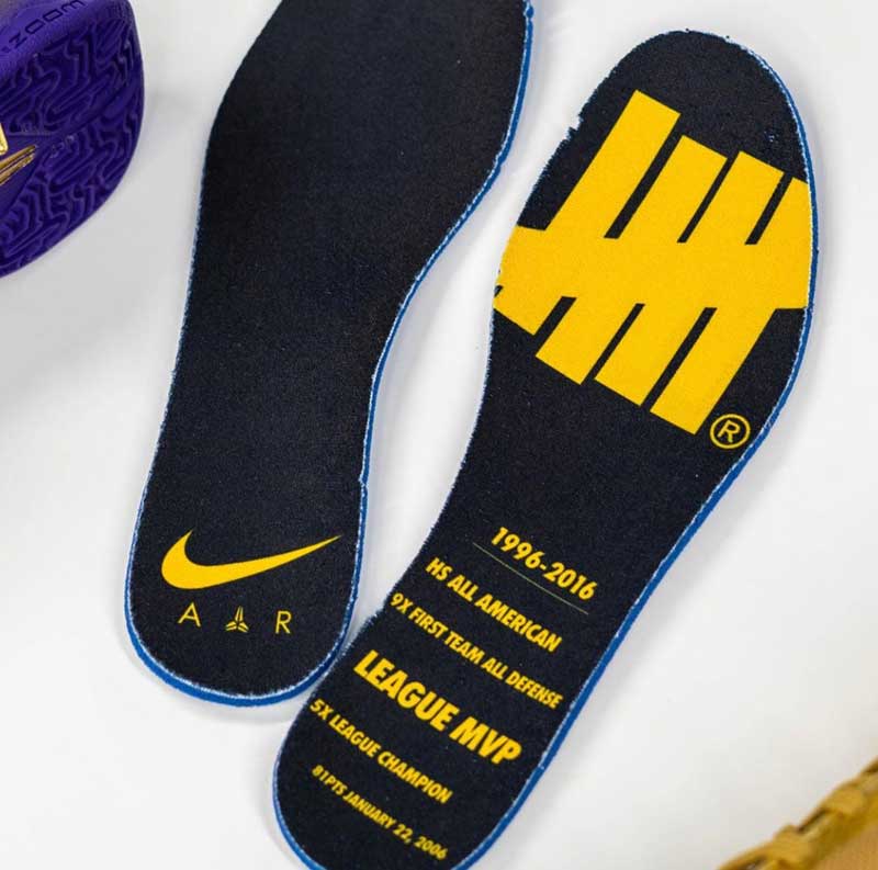 Les accomplissements de la légende des Lakers sont d’ailleurs rappelés sur la semelle à l’intérieur, et les différents numéros qu’il a porté sont discrètement imprimés sur la virgule.