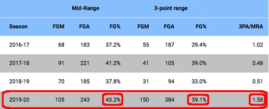 Le deuxième élément, c'est qu'Ingram a modifié son approche en attaque. Au lieu de faire du 3-points une arrière-pensée, Ingram en a fait sa première arme offensive.