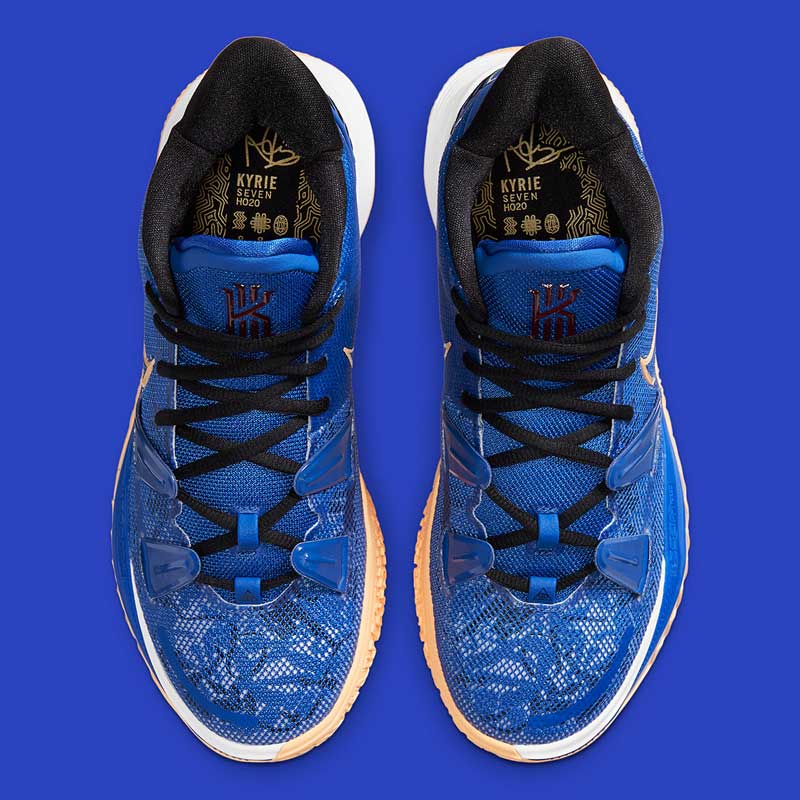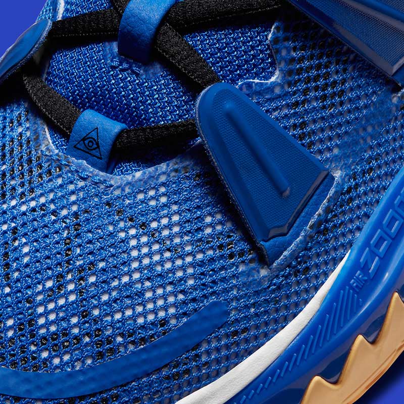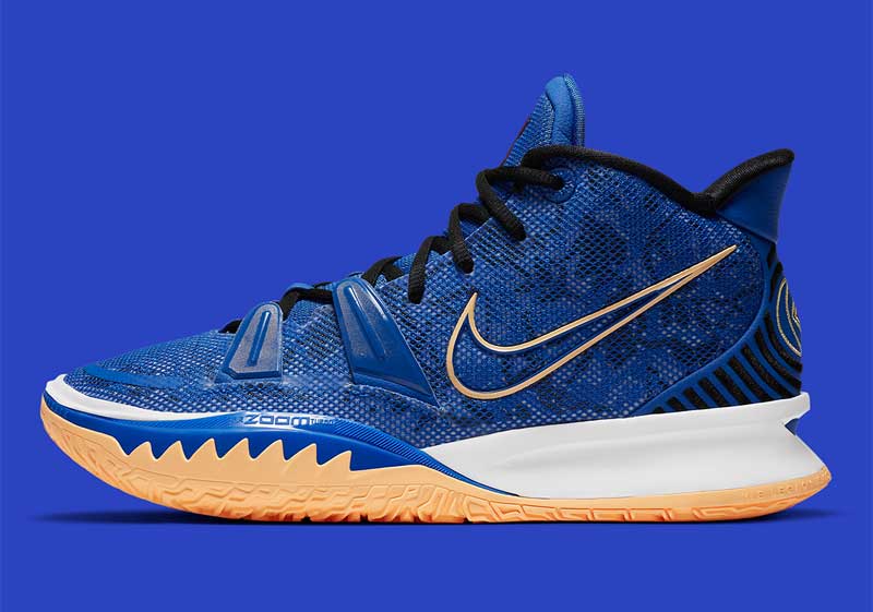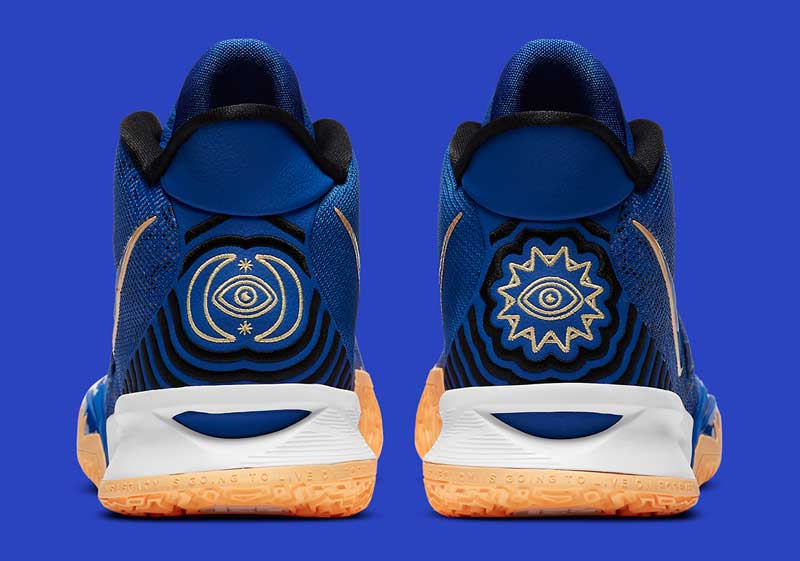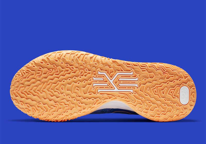 Le bleu est largement présent sur l’empeigne en mesh. Si on regarde attentivement, des dessins de personnes jouant au basket sont présents à travers le tissu. Des touches orangées décorent la semelle et la virgule.