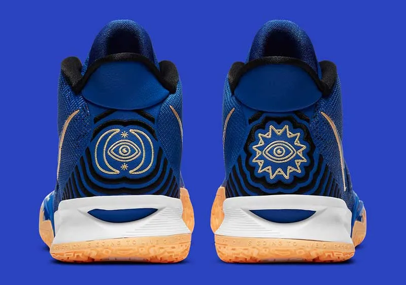 Le bleu est largement présent sur l'empeigne en mesh. Si on regarde attentivement, des dessins de personnes jouant au basket sont présents à travers le tissu. Des touches orangées décorent la semelle et la virgule.
