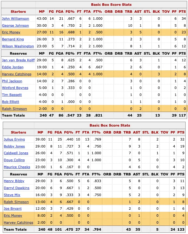 Entre le 8 novembre 1978 et le 23 mars 1979, il y a la date du 7 février 1979 qui va faire basculer cette partie dans les livres d'histoire de la NBA. En effet, ce jour-là, les Sixers et les Nets trouvent un accord pour un transfert : Harvey Catchings, Ralph Simpson et de l'argent sont envoyés à New Jersey en échange d'Eric Money et Al Skinner.