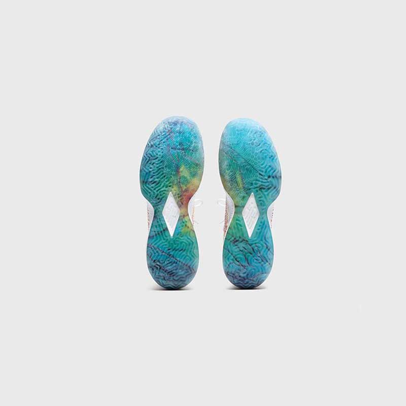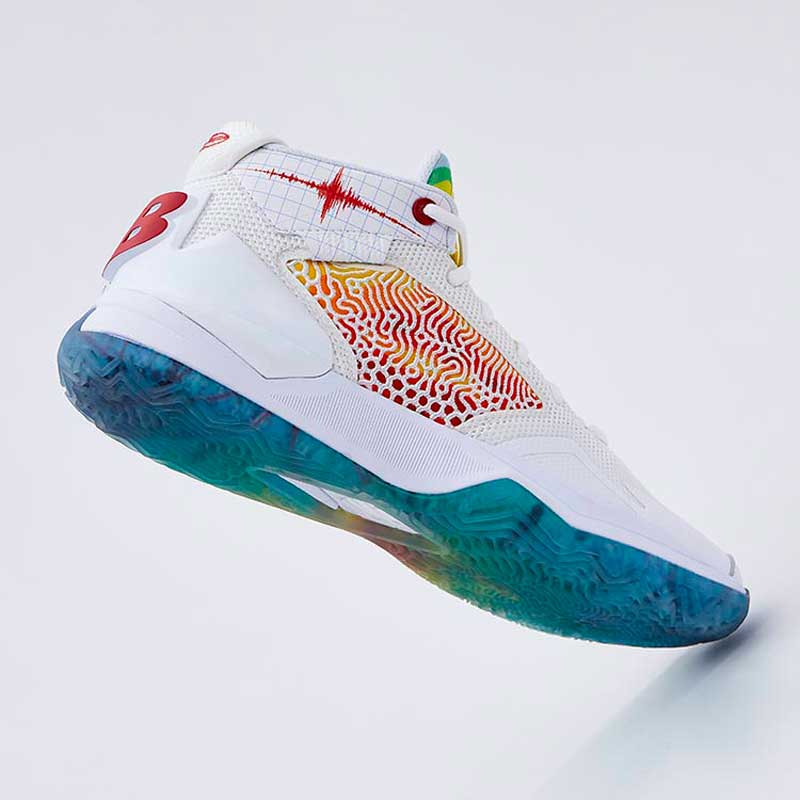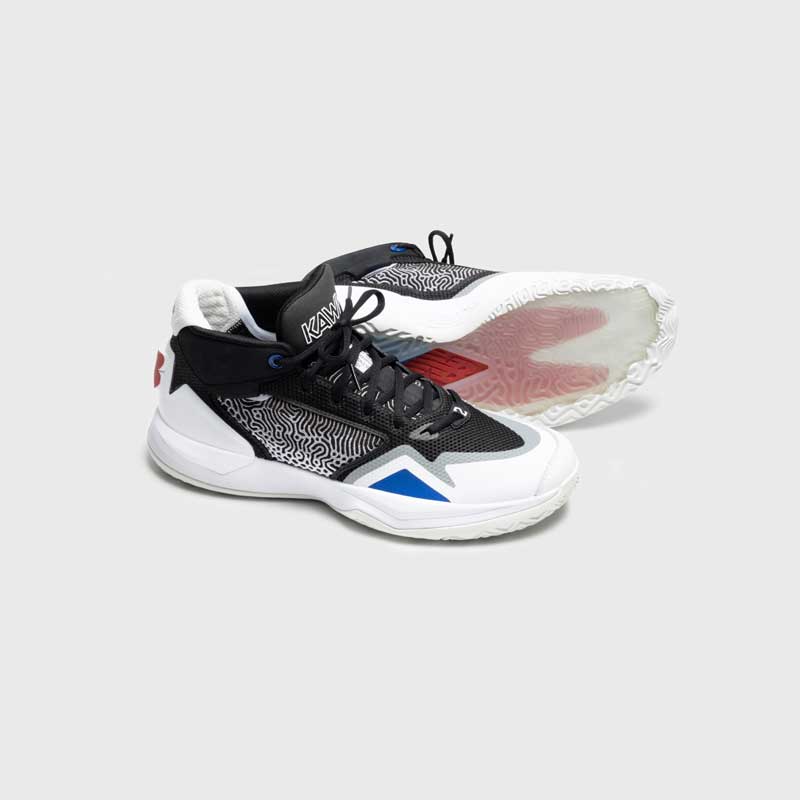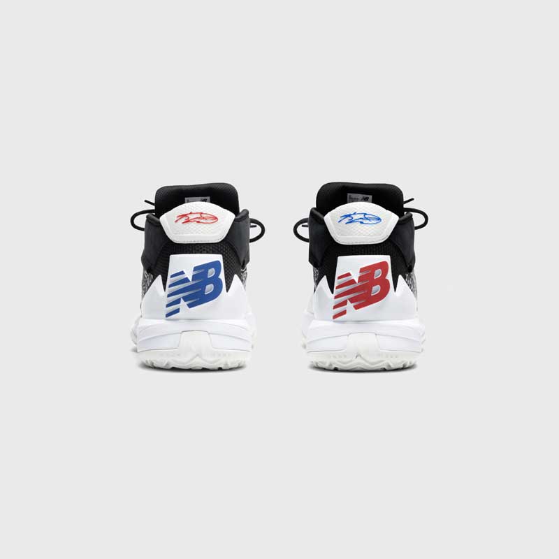 Sur une base noir/blanc, les quelques touches de bleu et rouge évoquent le maillot des Clippers. Un rappel qu’on retrouve encore plus largement sous la semelle.