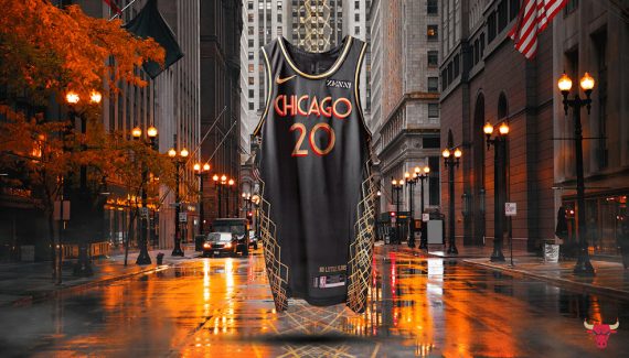 La franchise explique d’abord que la police “art déco” reprend celle utilisée au United Center, notamment à chaque entrée. Sur le short, le losange qui fait partie des signes distinctifs de l’ensemble. À l’intérieur du diamant se trouvent les quatre étoiles du drapeau de Chicago. Les étoiles sont placées dans les coins du losange pour imiter l’aspect des éléments de ferronnerie des gratte-ciels de la ville. Le losange est ensuite décliné sur le flanc du maillot avec des motifs qui rappellent l’influence de l’Art déco dans les bâtiments de la ville.