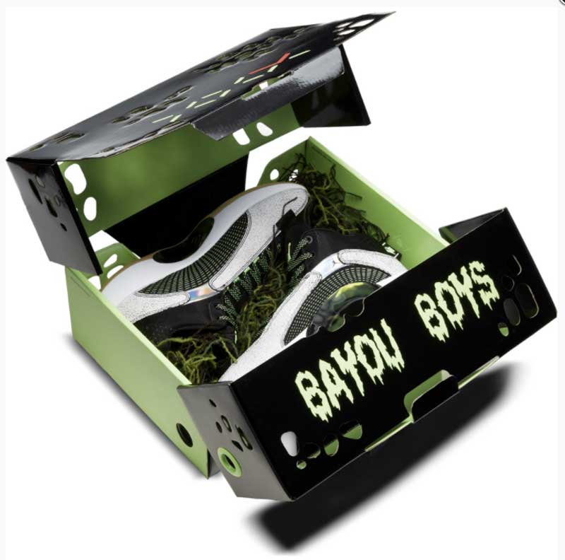 Initialement annoncée pour le 30 novembre, la teinte Bayou Boys sera disponible dès ce samedi 21 novembre. Posée une superbe semelle gomme, elle propose du noir, du gris craquelé et des touches de vert. L’idée est de reproduire l’ambiance de la ville de la Nouvelle-Orléans, mais surtout des marécages de la région.