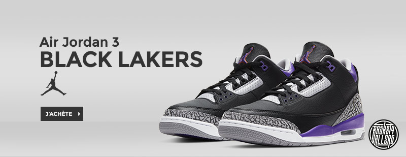 Procurez-vous maintenant sur Basket4Ballers.com les Air Jordan 3 “Black Lakers” version modifiée du coloris « Black Cement » d’origine qui arbore l’emblématique couleur violette des Los Angeles Lakers pour un look rétro inspiré de la chaussure légendaire de Michael Jordan.