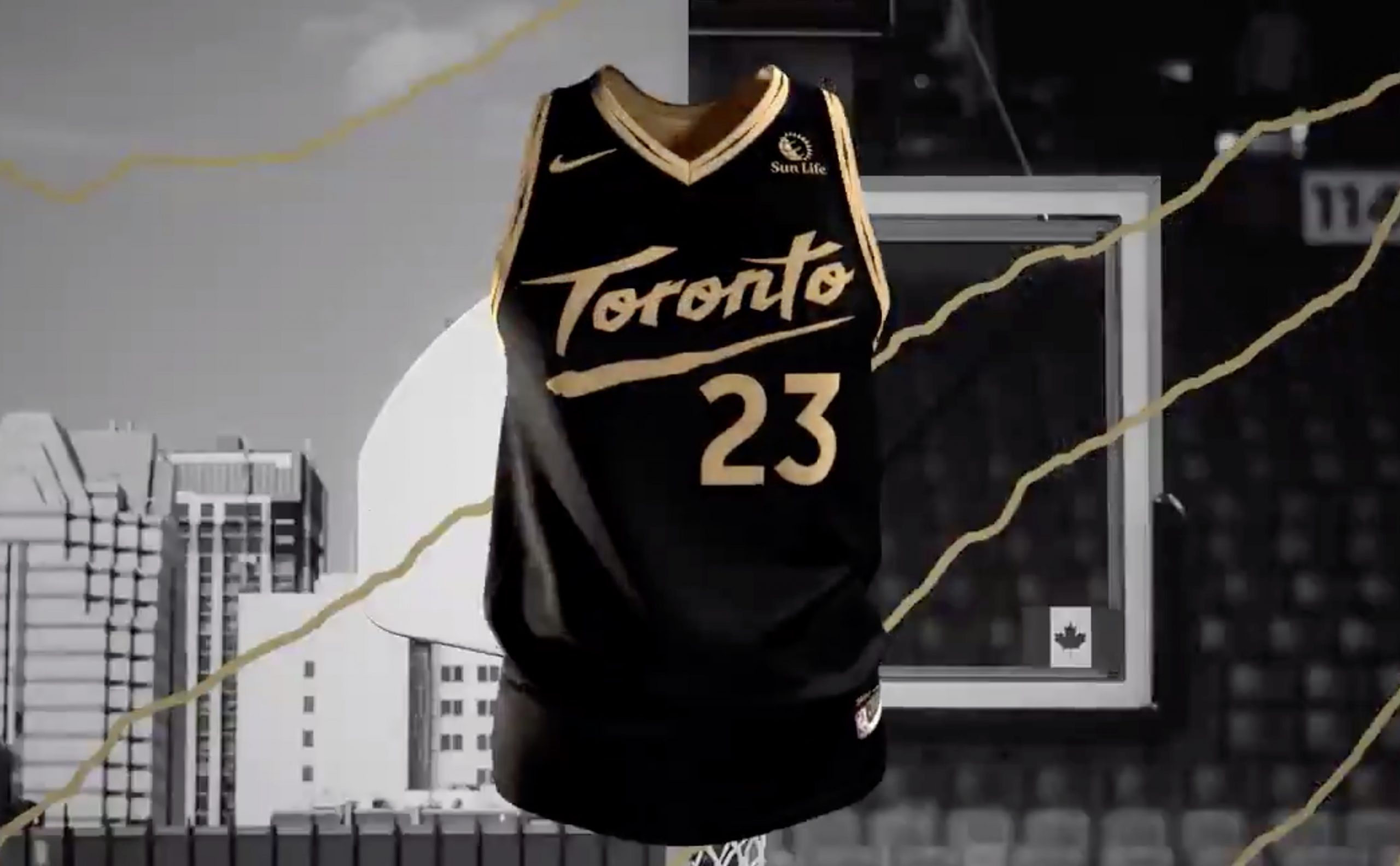 La tunique est toujours noir et or, avec un col qui passe juste de la première couleur à la deuxième. Un coup de griffe est ajouté sous le « Toronto » présent sur le torse, trois autres sur le short.